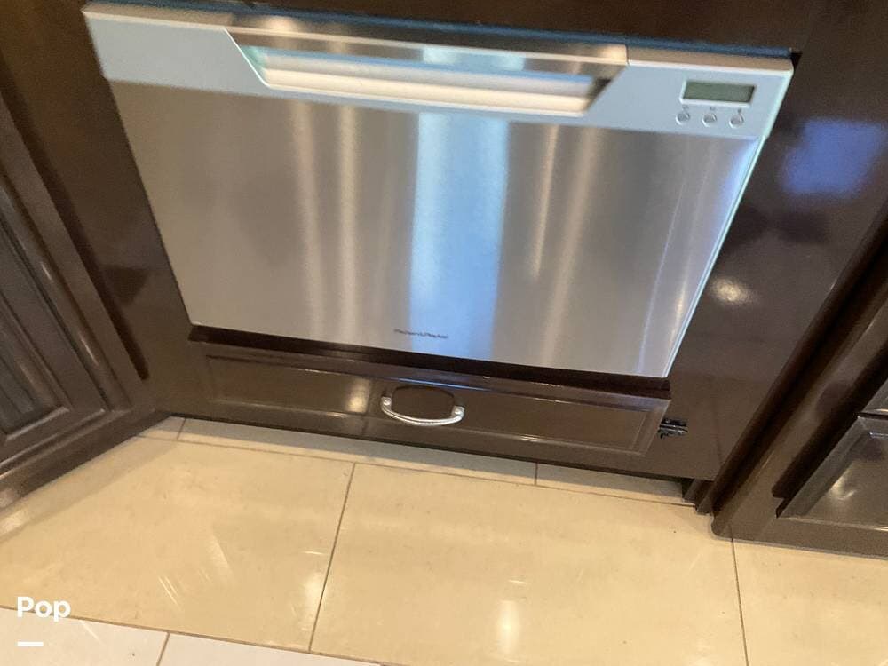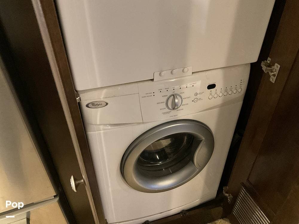 Moving into the kitchen, you'll enjoy a double sink, a stove with a microwave, and a pull-out cabinet area. The kitchen also includes a full-size refrigerator and freezer, as well as a washer and dryer for added convenience.