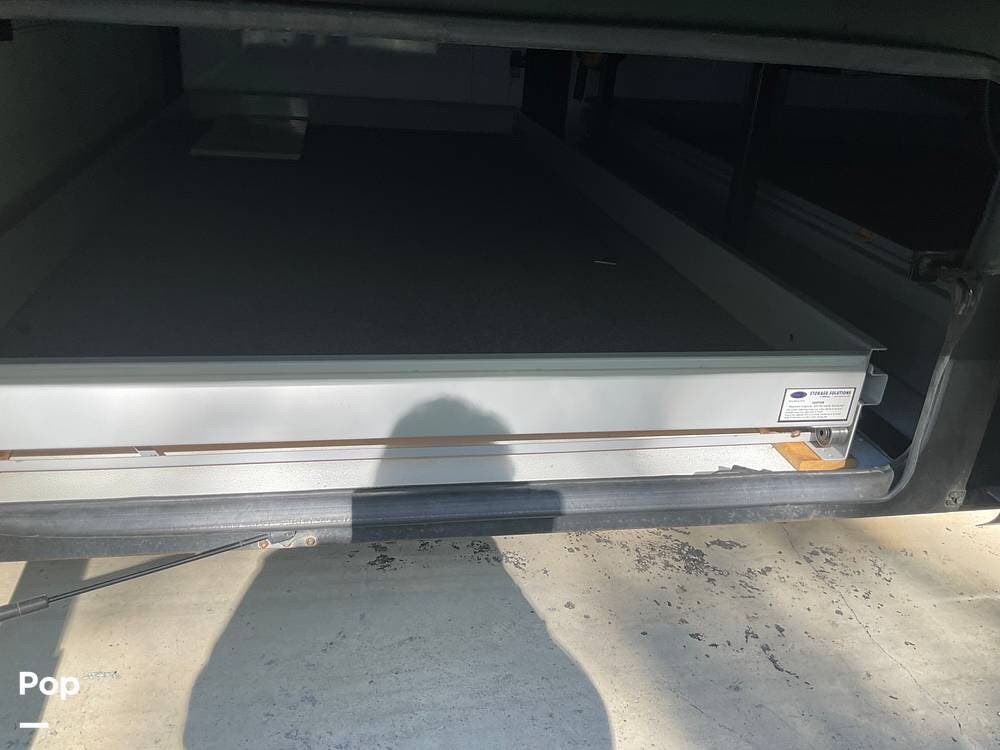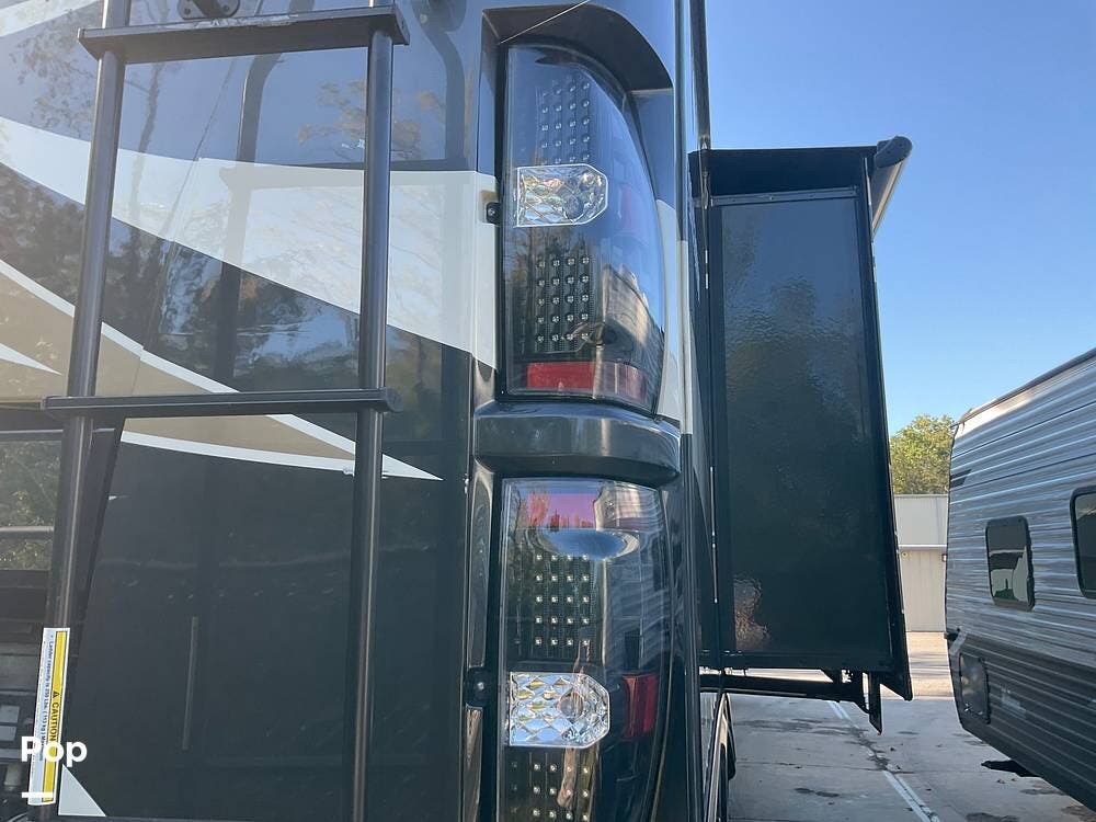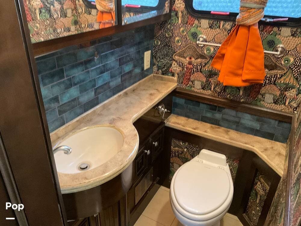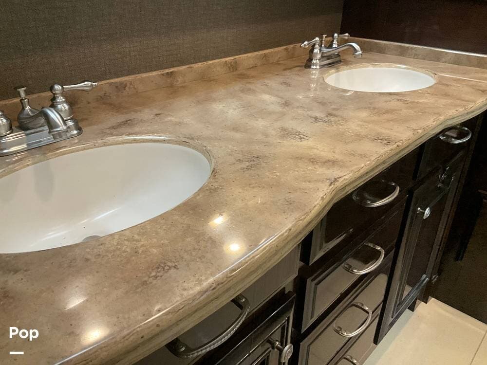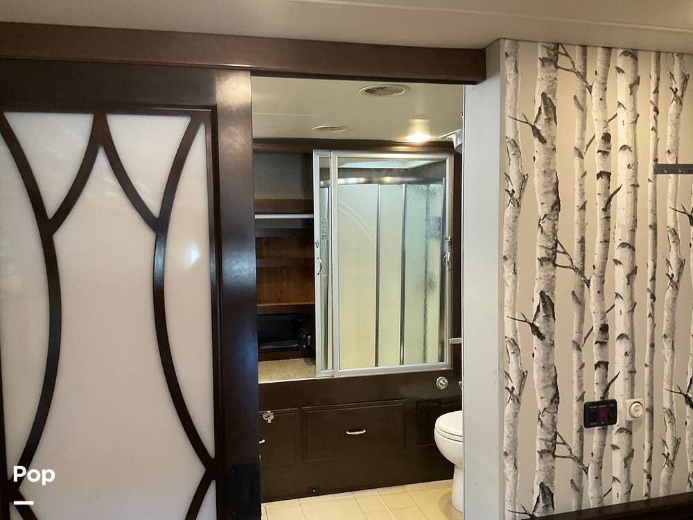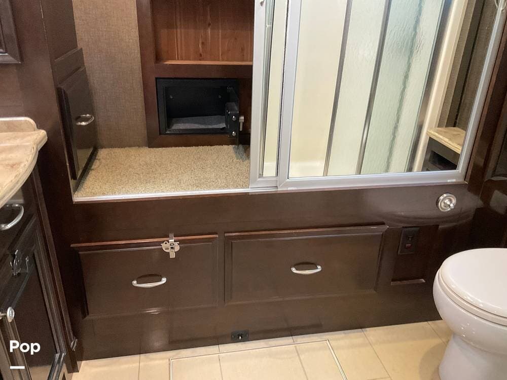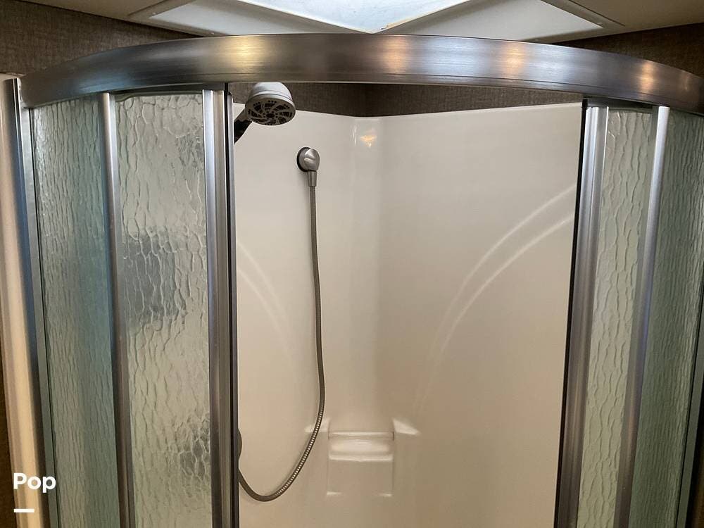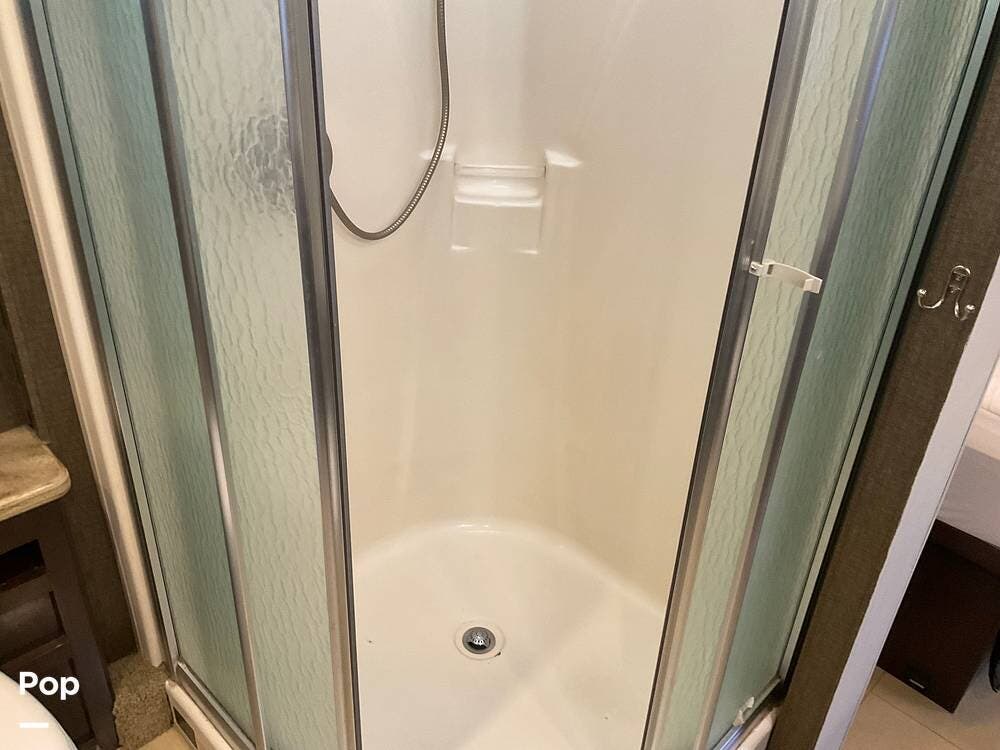 At the rear of the RV, accessible through the master bedroom, is the master bathroom. It features a large 39" x 39" shower, a toilet, and additional storage space.