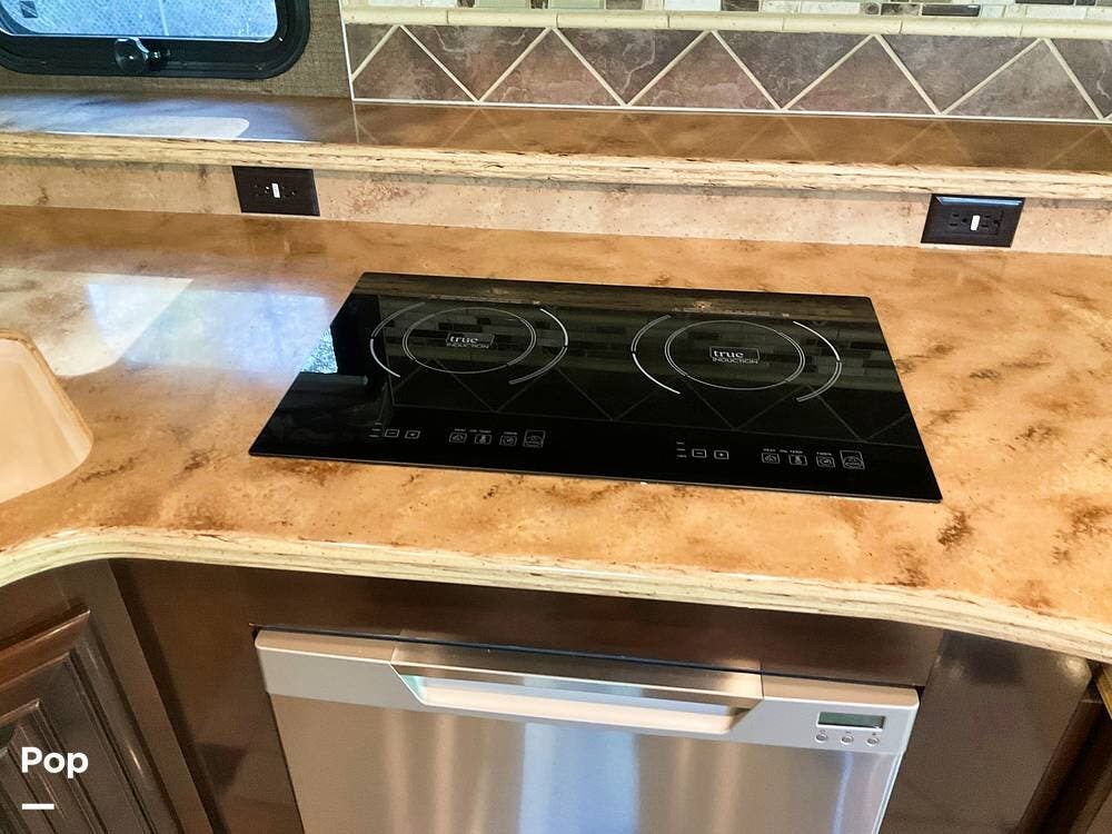 The kitchen features a double sink, stove, and microwave/convection oven that was replaced less than a year ago. A full-size residential refrigerator and freezer provide ample storage, and a washer and dryer make extended travel convenient.