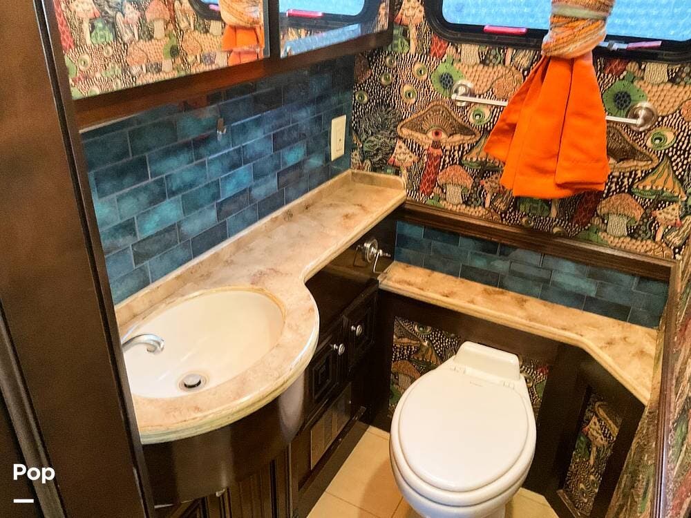 Toward the rear of the coach is the master bedroom featuring a king-size bed, plenty of storage, and a 32-inch LED TV. Just beyond the bedroom is the spacious master bathroom with a 39" x 39" shower, toilet, storage cabinets, and a macerator system.