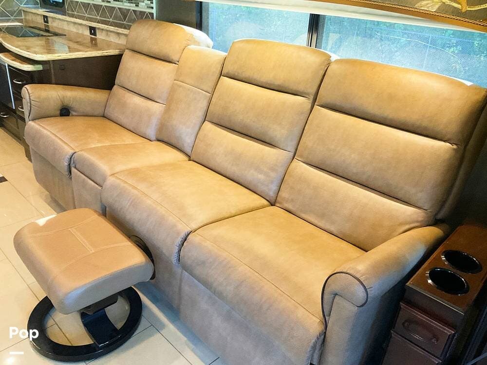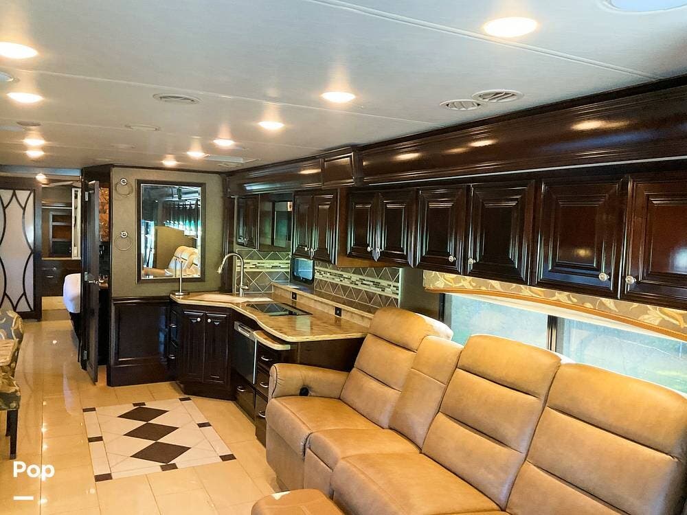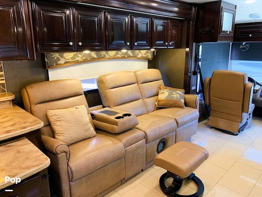 The main living area opens up nicely with opposing slide-outs, creating a comfortable space to relax. Two recliners provide seating across from a fireplace and 50-inch LED HD TV, while a desk and additional chair offer a convenient workspace for those traveling or working remotely. Large windows and generous cabinetry throughout the coach add both natural light and storage.