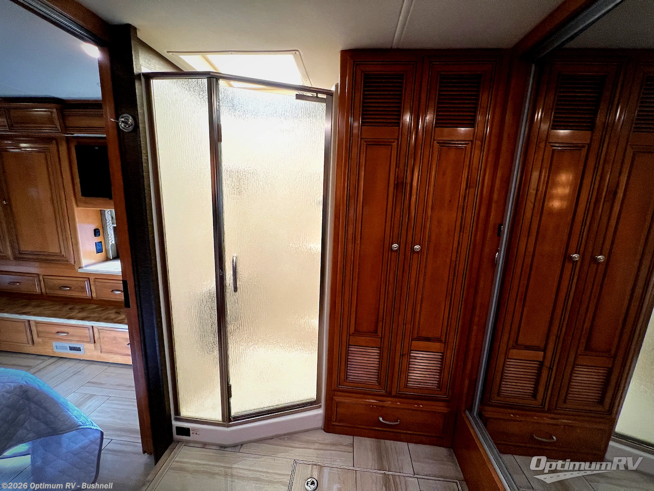 Sliding doors leads you into the rear master bath where you will find a 34" x 34" shower, washer and dryer, and full rear wall wardrobe. The toilet and sink are opposite along the road side and also part of the bedroom slide out.