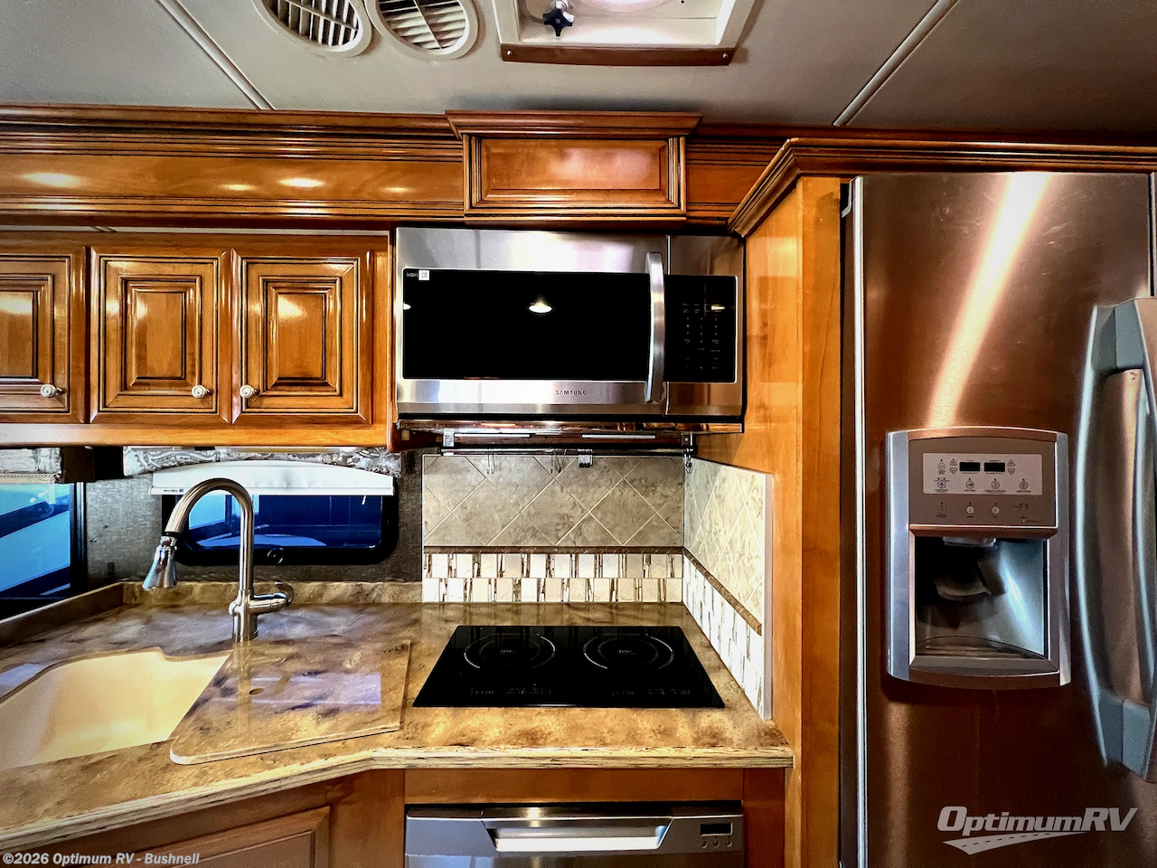 The curb side slide not only features theater seating, but also the kitchen and bedroom storage area as well. You will easily be able to cook up light meals and snack as you travel with a double sink, a two burner range top with overhead microwave, refrigerator, and pantry. There is also plenty of storage both above and below the counter area.