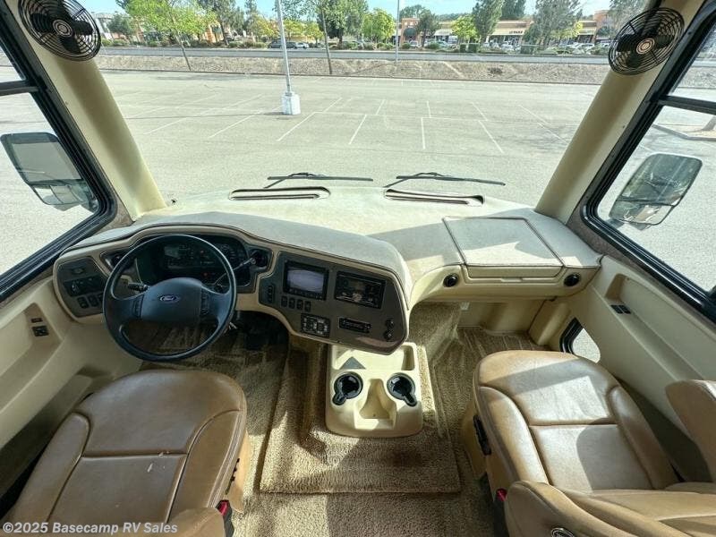 As you enter the coach, the front includes two captain's chairs, overhead cabinets at each side, an optional TV at the center front and an optional driver side door.