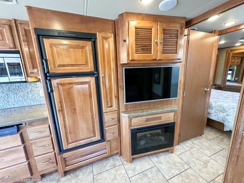 The rear bedroom has a slide with a queen bed that has nightstands at each side and overhead cabinets above the head of the bed. The rear wall of the coach features a large storage area, while the wall opposite the bed features a wardrobe with drawers below, and a vanity with a TV above it.