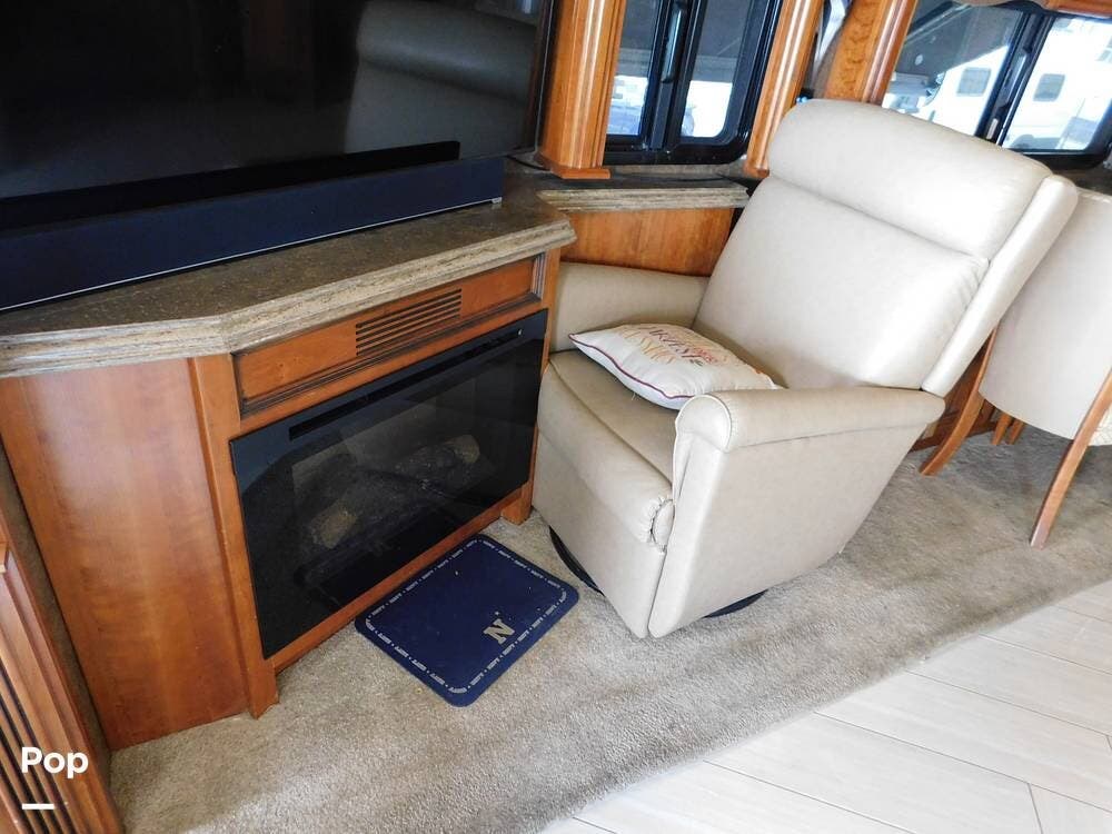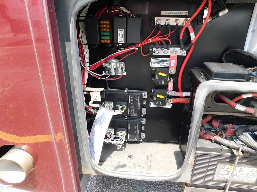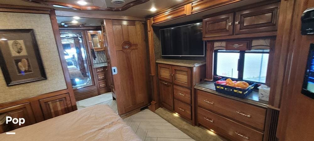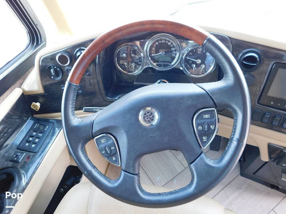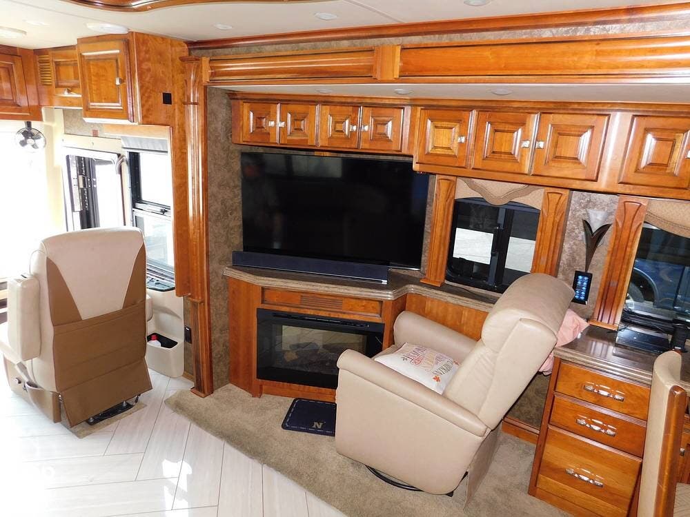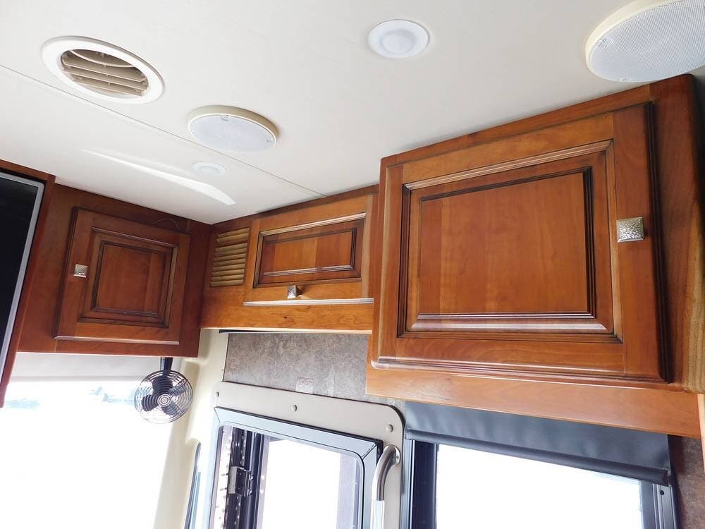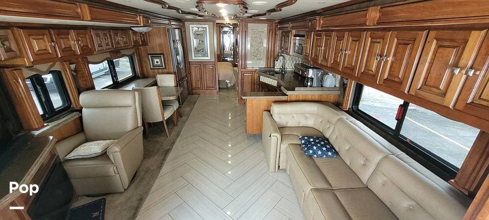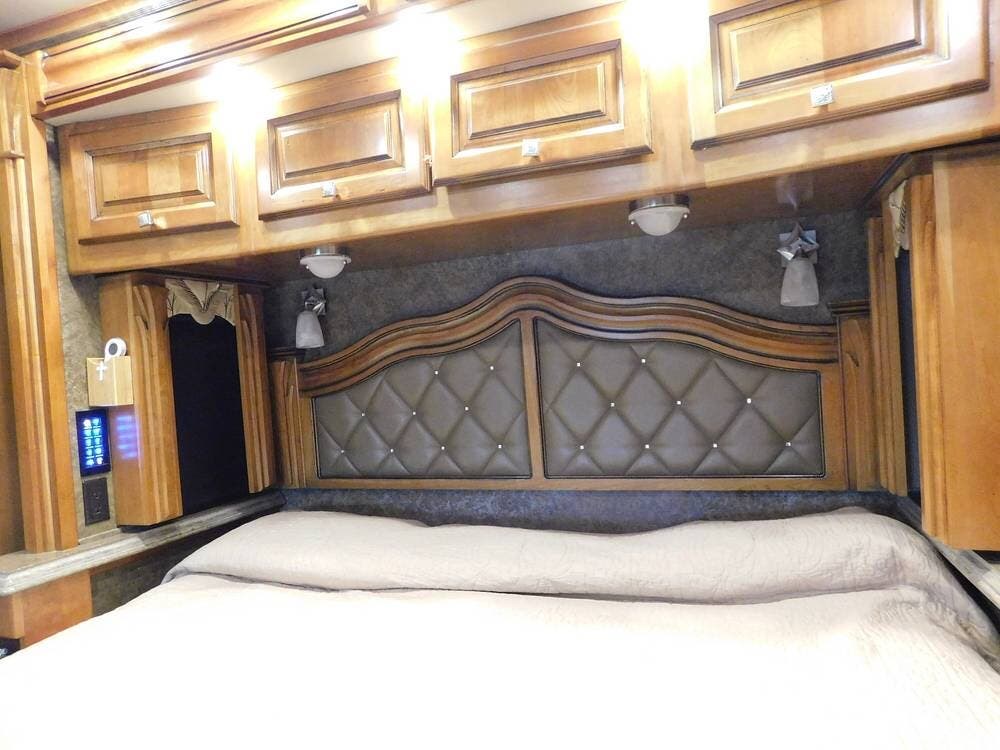 On the road, offering a quiet ride sitting on the custom-built Powerglide chassis. Powered by a 450HP ISL9 Cummins motor with an Allison 3000 MH 6-speed tranny able to tow up to an astonishing 15,000 pounds!