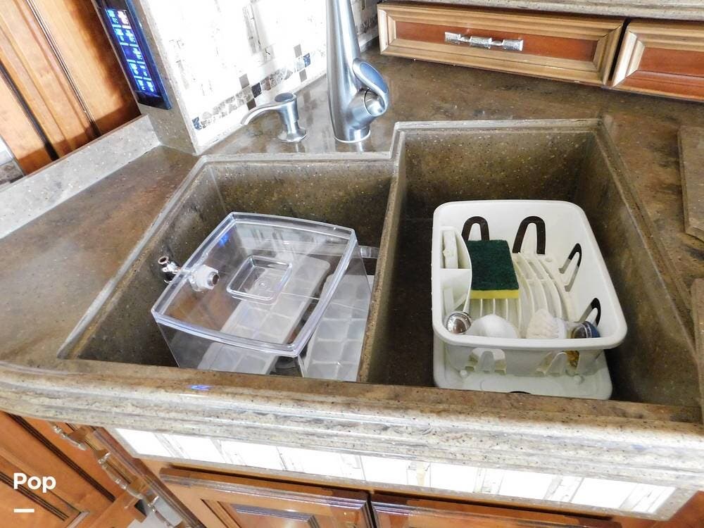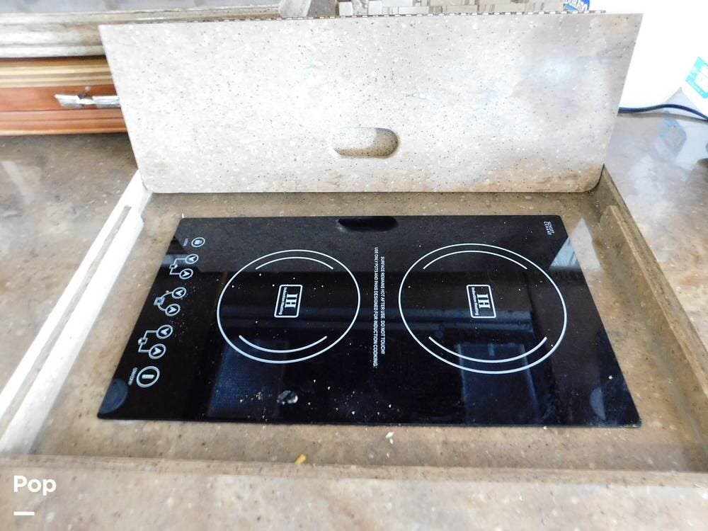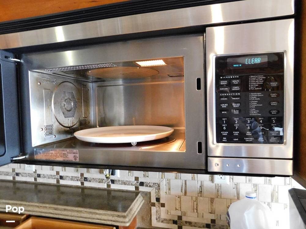 The galley features an expand-an-island, a 2-burner induction cooktop, a large double bowl sink, a dishwasher, and a convection microwave. Right behind the galley is
