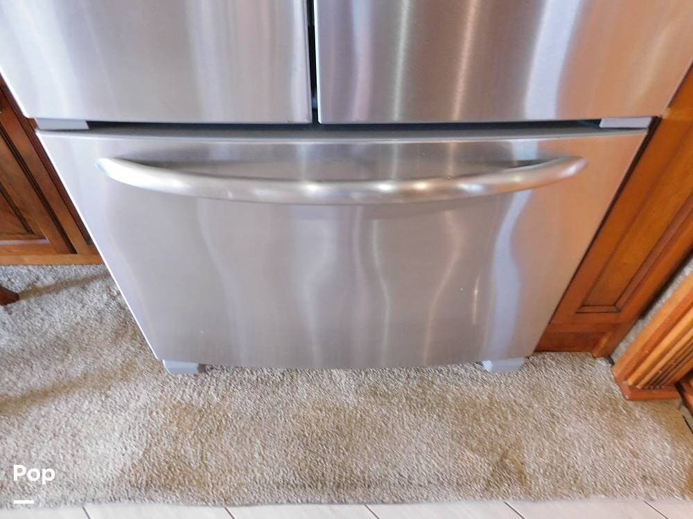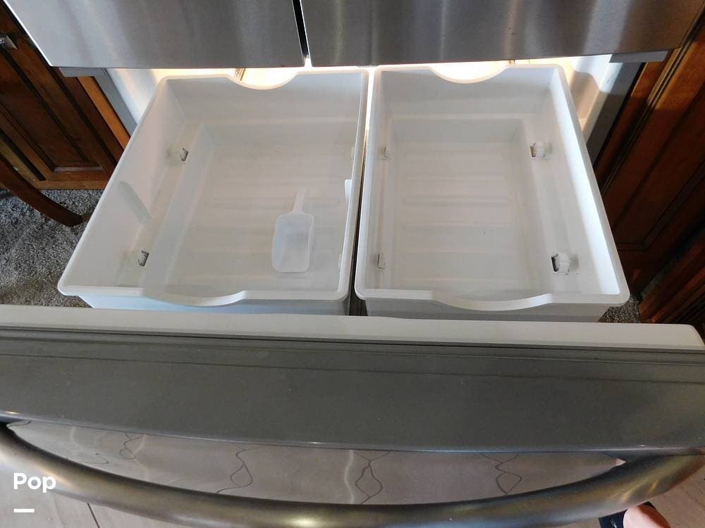 Now we head aft to the expandable dining room table with a computer workstation. Behind the dining table is a stainless steel 3-door residential refrigerator with water and ice in the door.