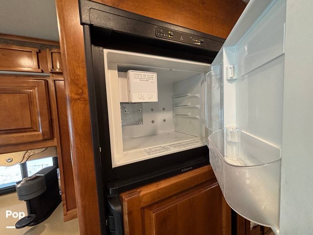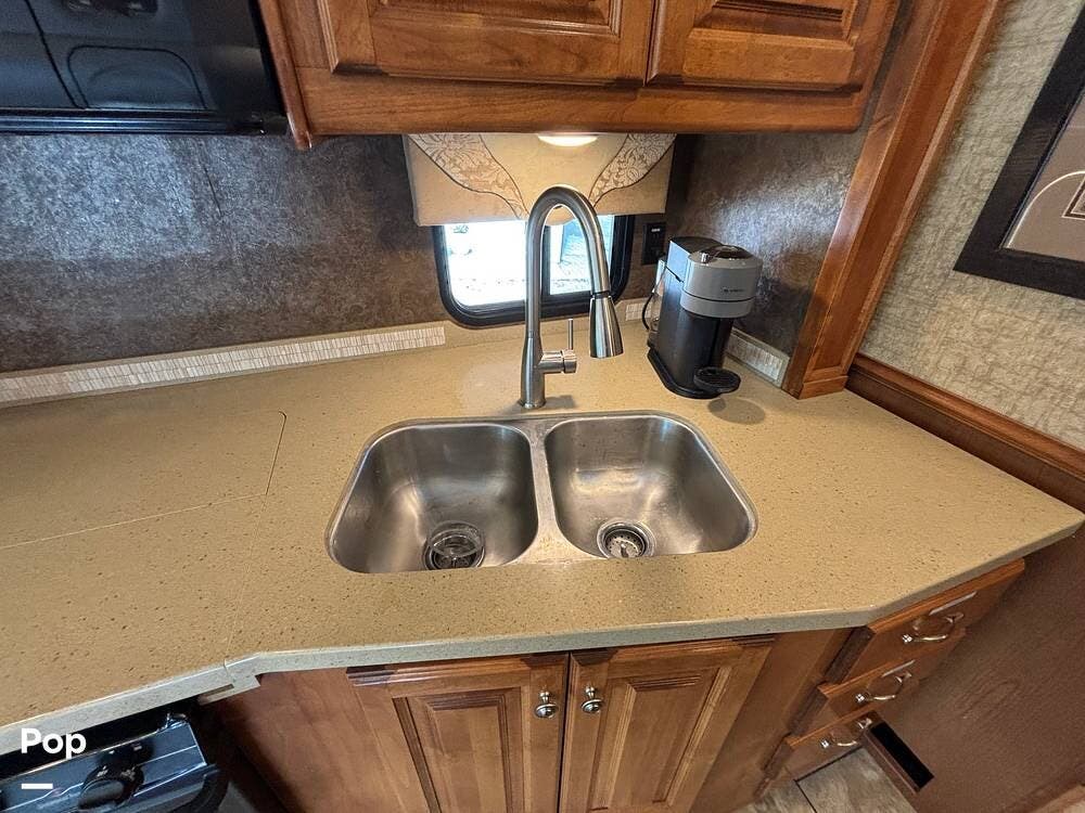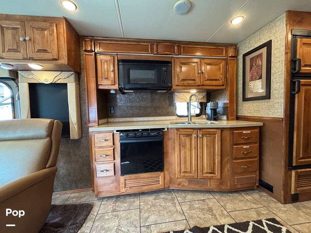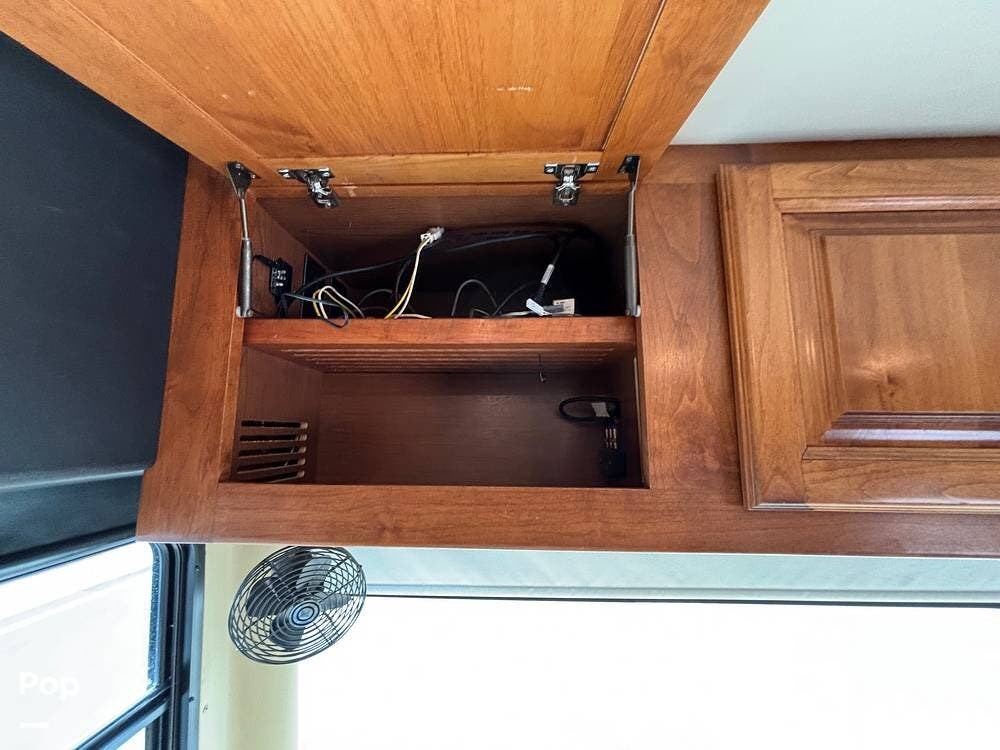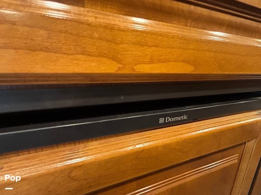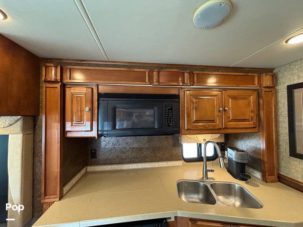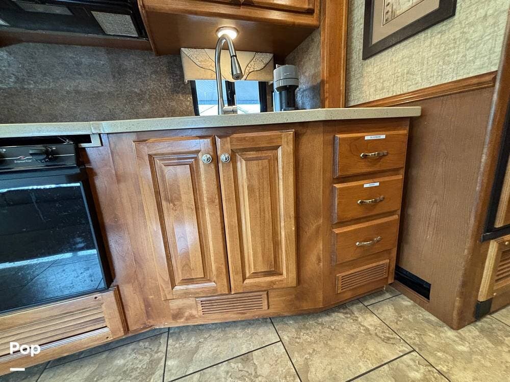Higher-end materials in this coach include gloss hardwood cabinetry with solid wood cabinet doors.