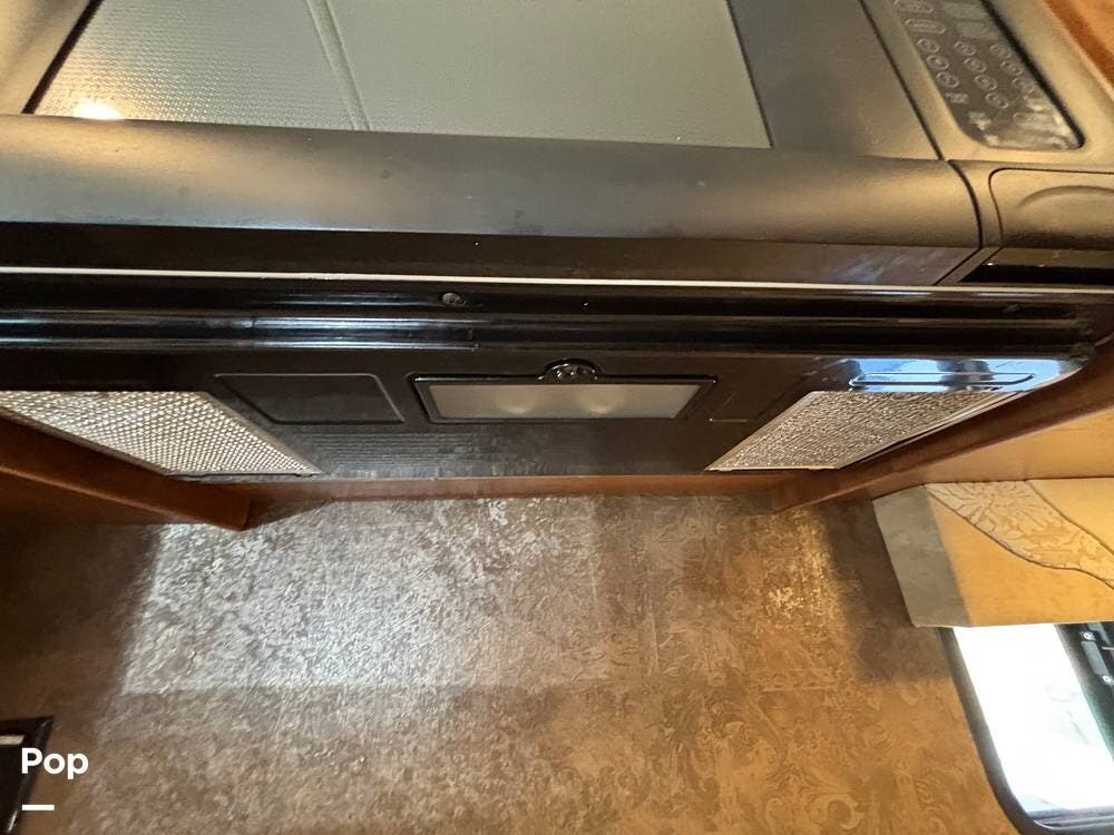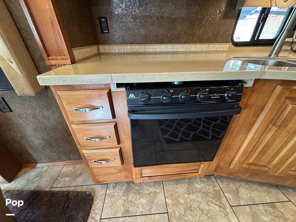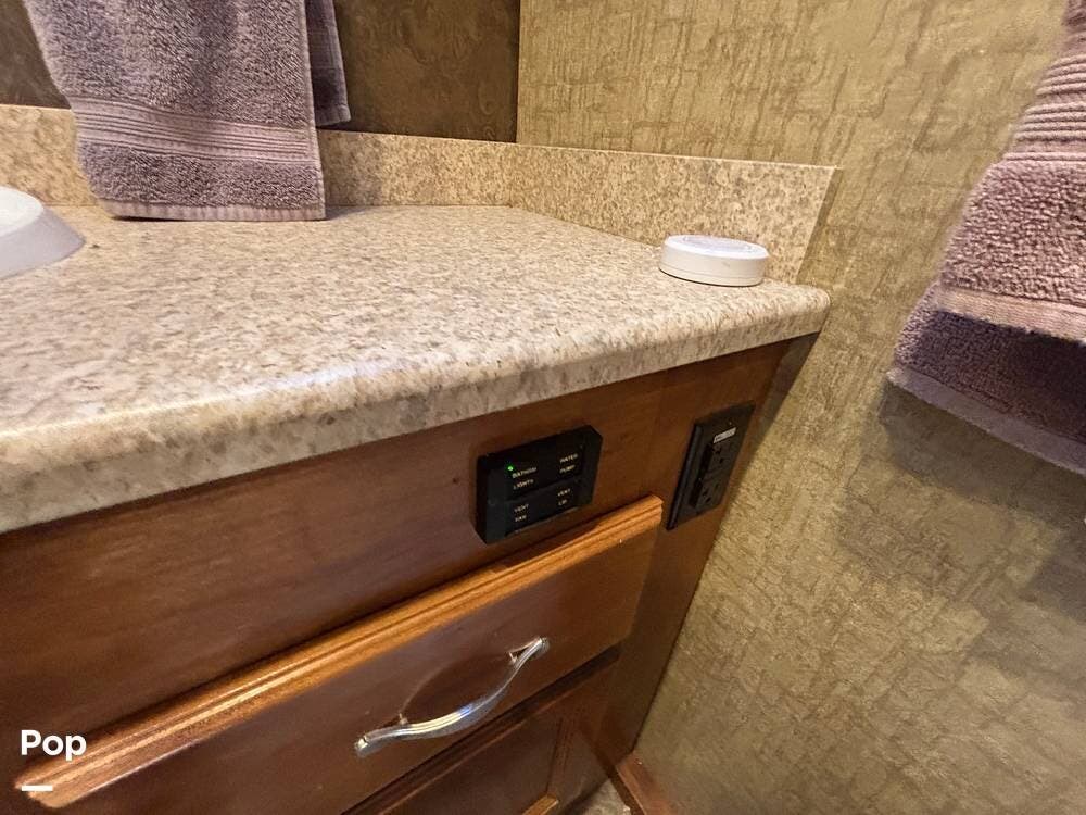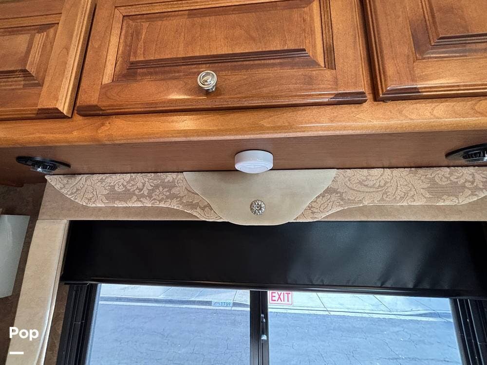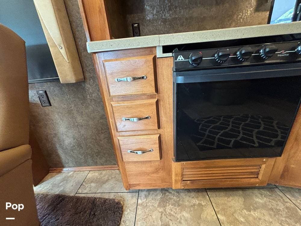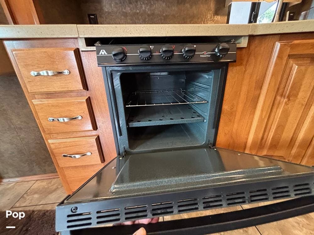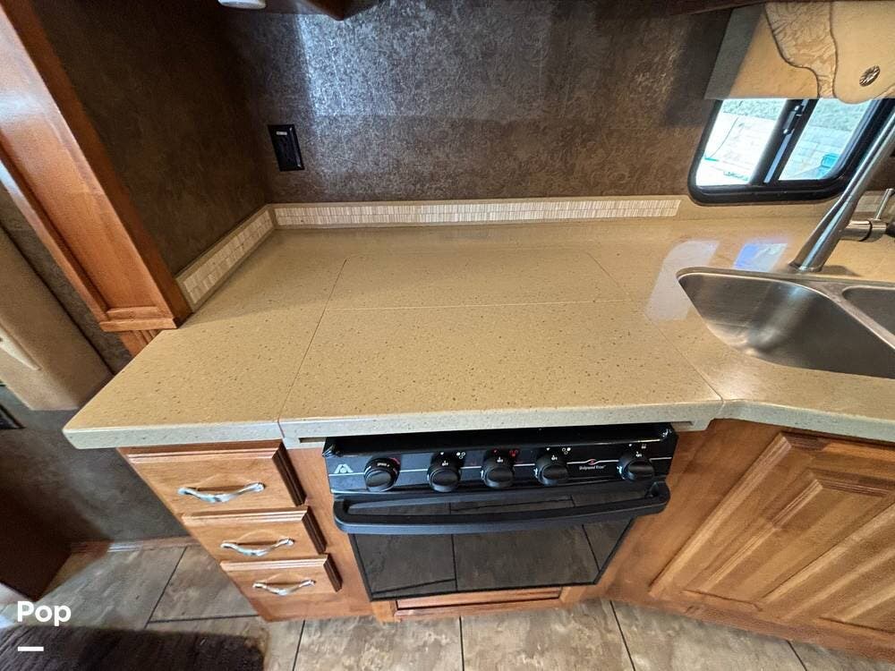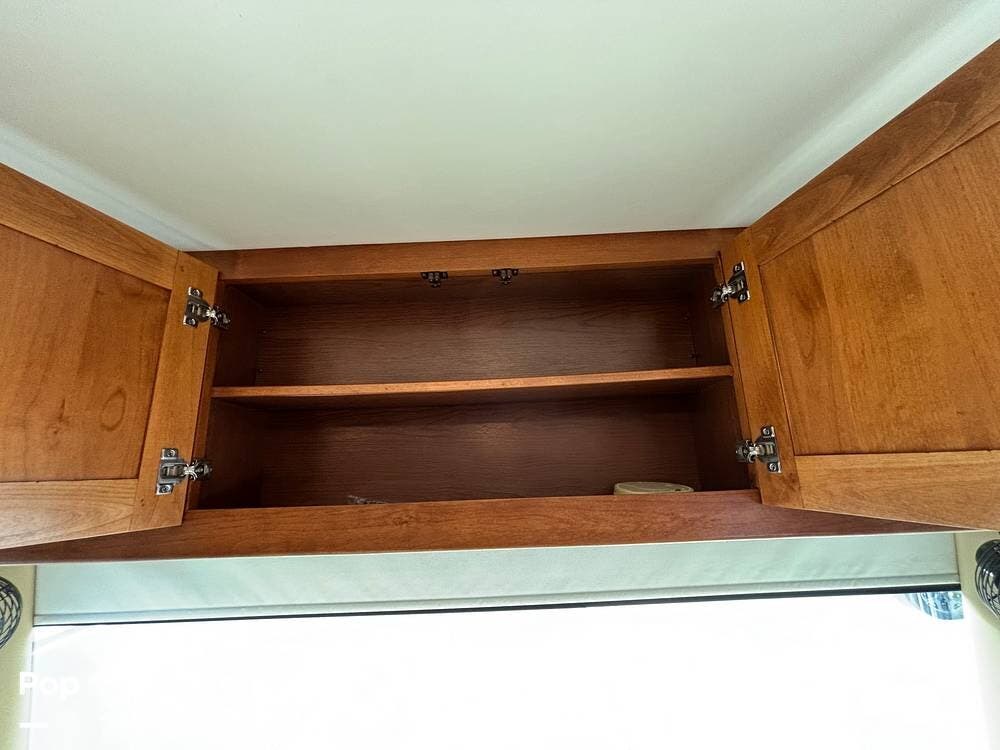 Higher-end materials in this coach include gloss hardwood cabinetry with solid wood cabinet doors.