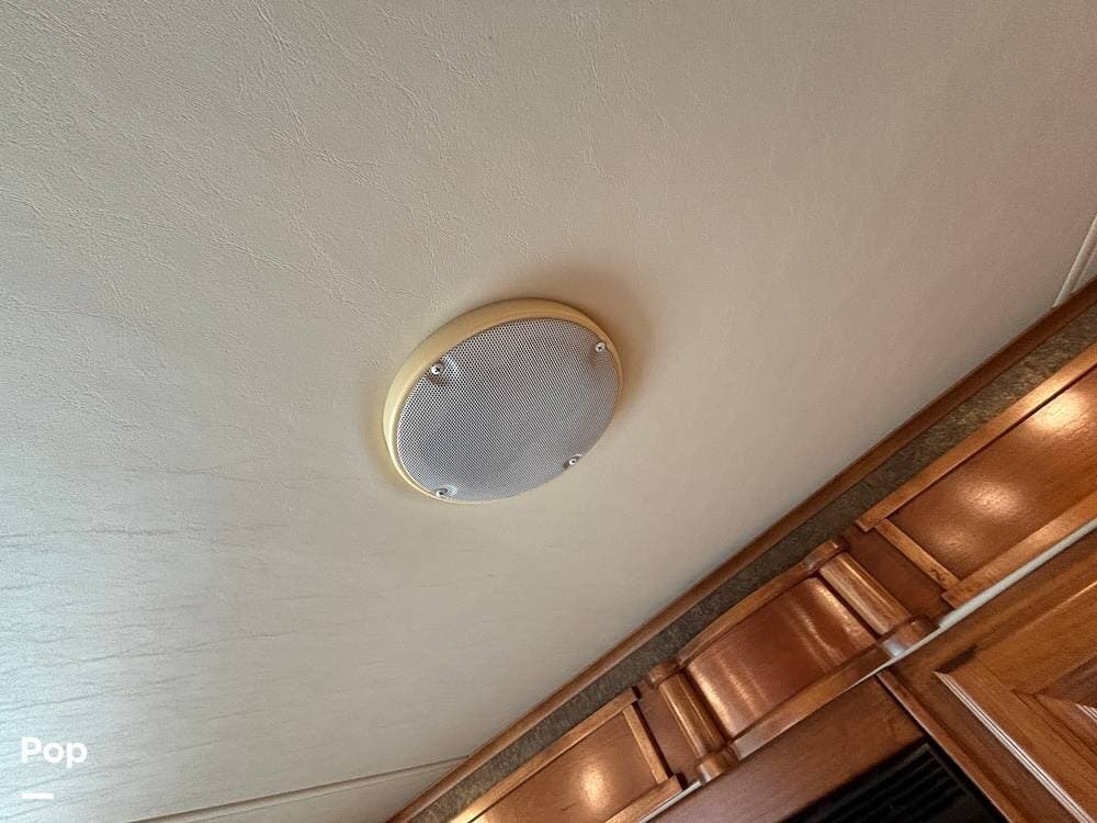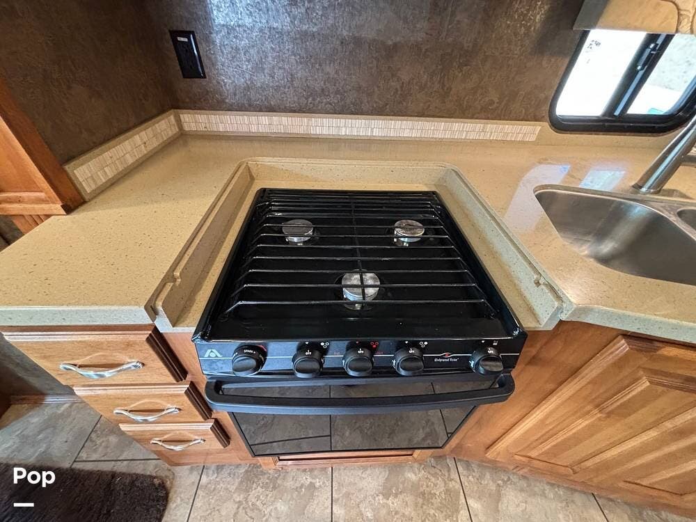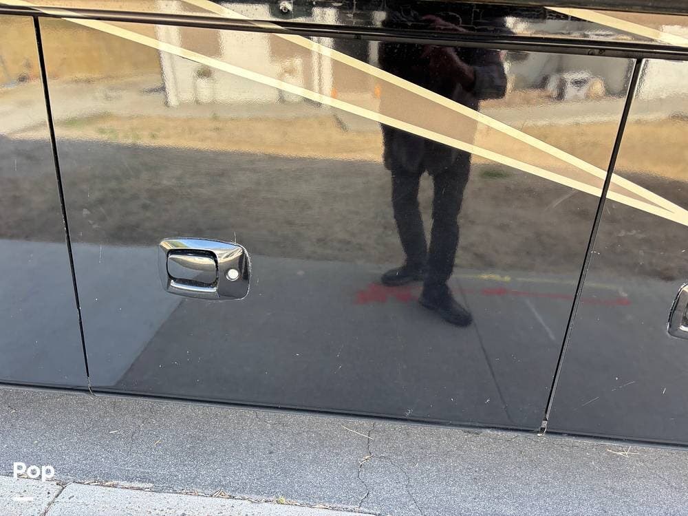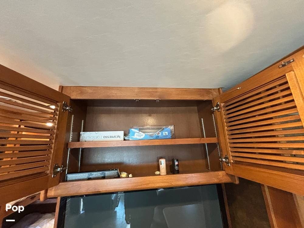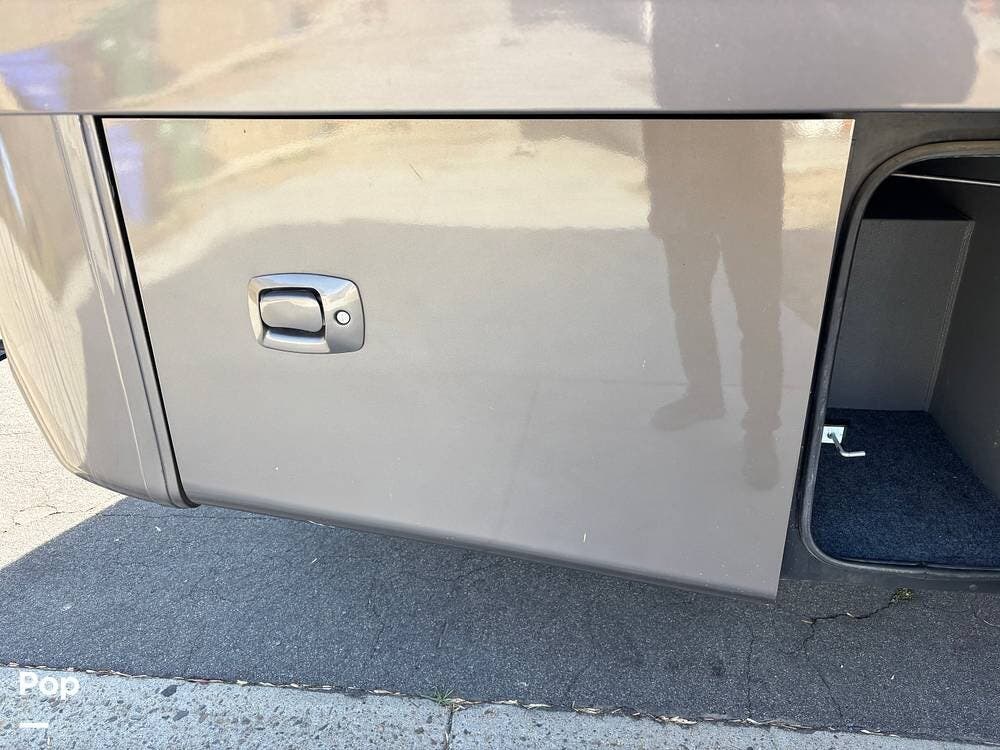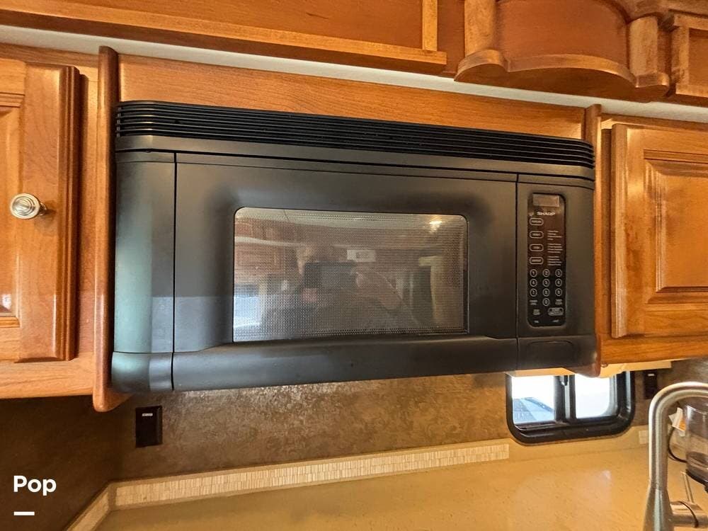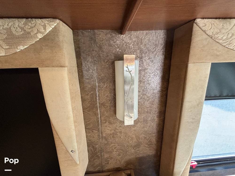 Higher-end materials in this coach include gloss hardwood cabinetry with solid wood cabinet doors.
