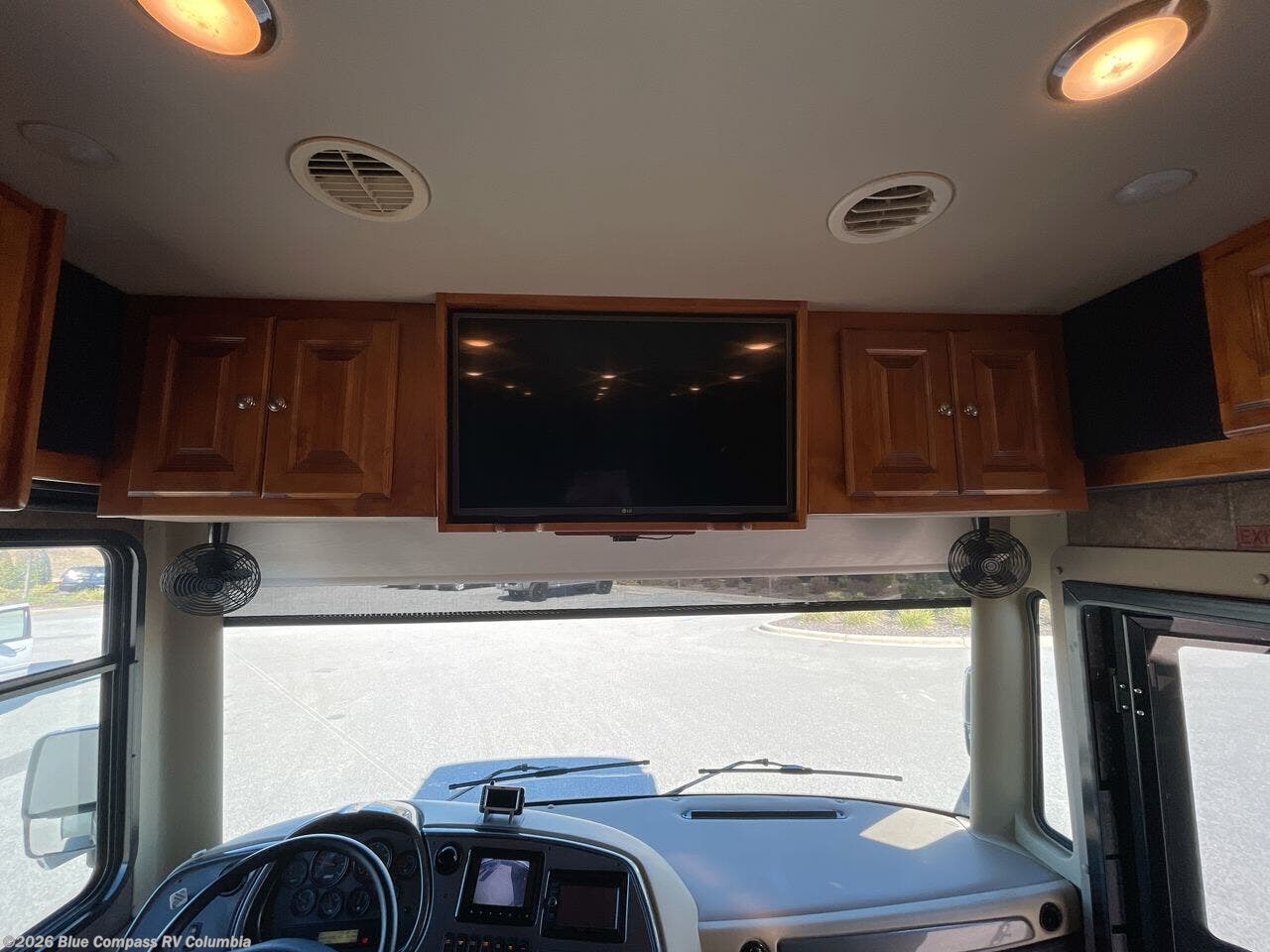 The front cab area features swivel captain and passenger chairs providing added seating when parked. There is plenty of storage in overhead cabinets along the front and both sides, plus you can choose to add an optional TV if you wish.