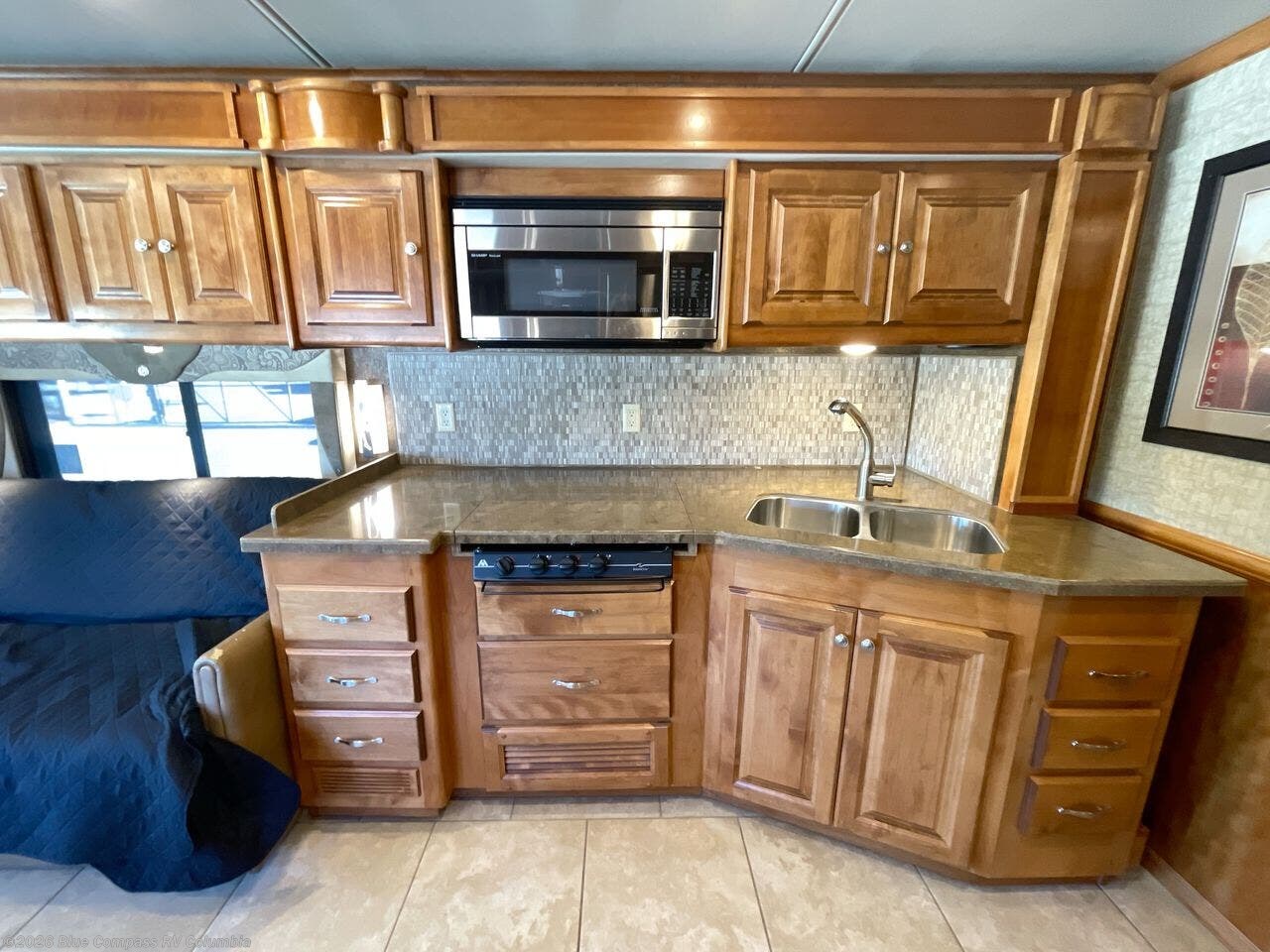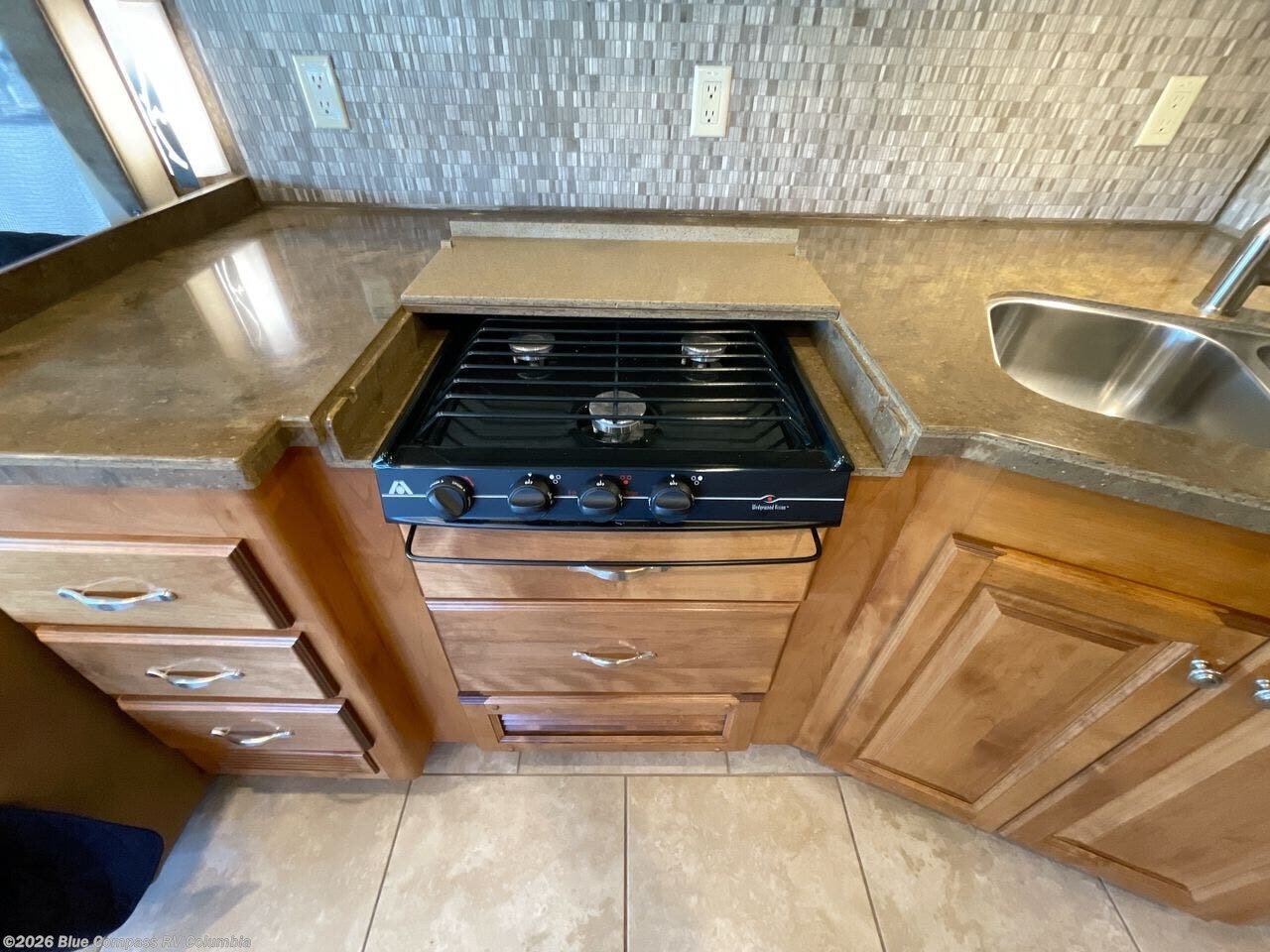 The curb side provides a slide out sofa, lots of overhead cabinets, a three burner range, overhead microwave, and angled kitchen sink. A closet for an optional washer/dryer is just off the slide out before the bedroom area.