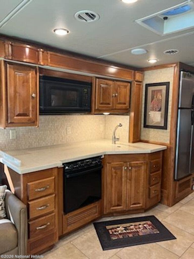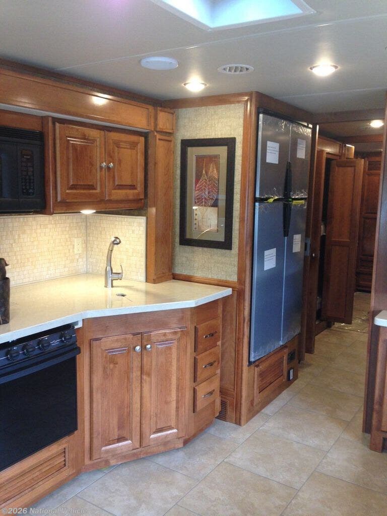Just behind the passenger seat enjoy a slide out sofa, three burner range with overhead microwave oven, and double kitchen sink. There is a two door refrigerator and pantry just off that slide to make the kitchen area complete.