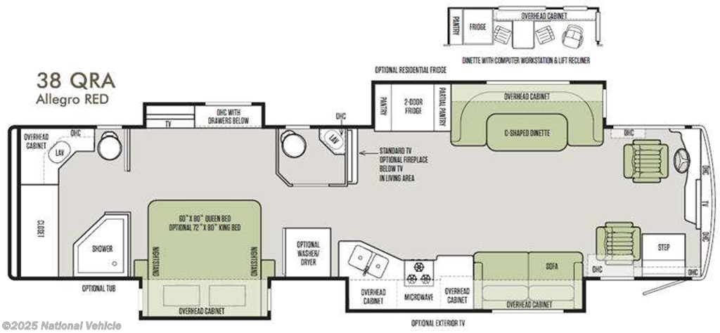Built with quality in mind, the Allegro RED 38QRA offers a strong foundation of features: a fully integrated chassis from Freightliner, premium full?body paint, an 8 kW Onan generator, power awning, and generous tank capacities (for example: ~90 gallons fresh water, ~70 gallons grey, ~50 gallons black) to support extended travel without constant breaks. If you?re looking for a high caliber coach that blends luxury living and road performance, this Tiffin model stands out as a refined option.