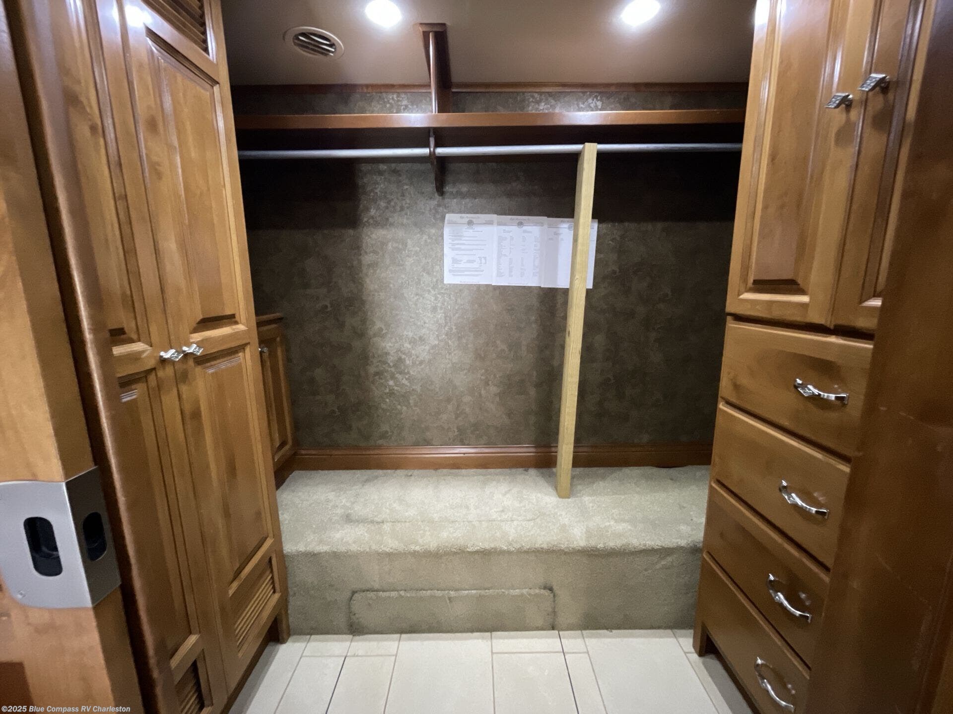 At the rear of this class A diesel coach there is a shelf with hanging rod below, drawers, and a closet for an optional washer/dryer all within a walk in wardrobe.