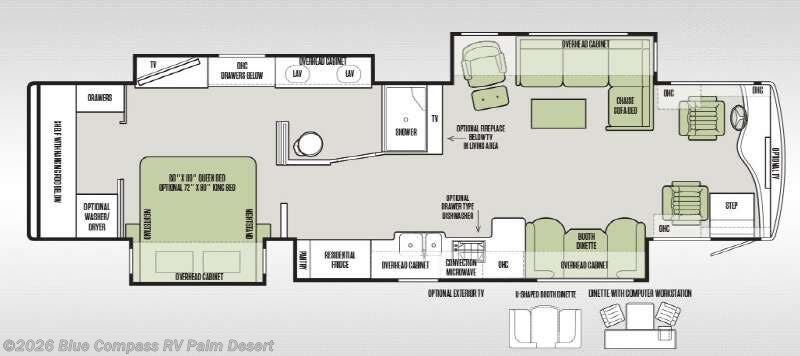 The front cab area has lots of overhead cabinets and room for an optional center mount TV.