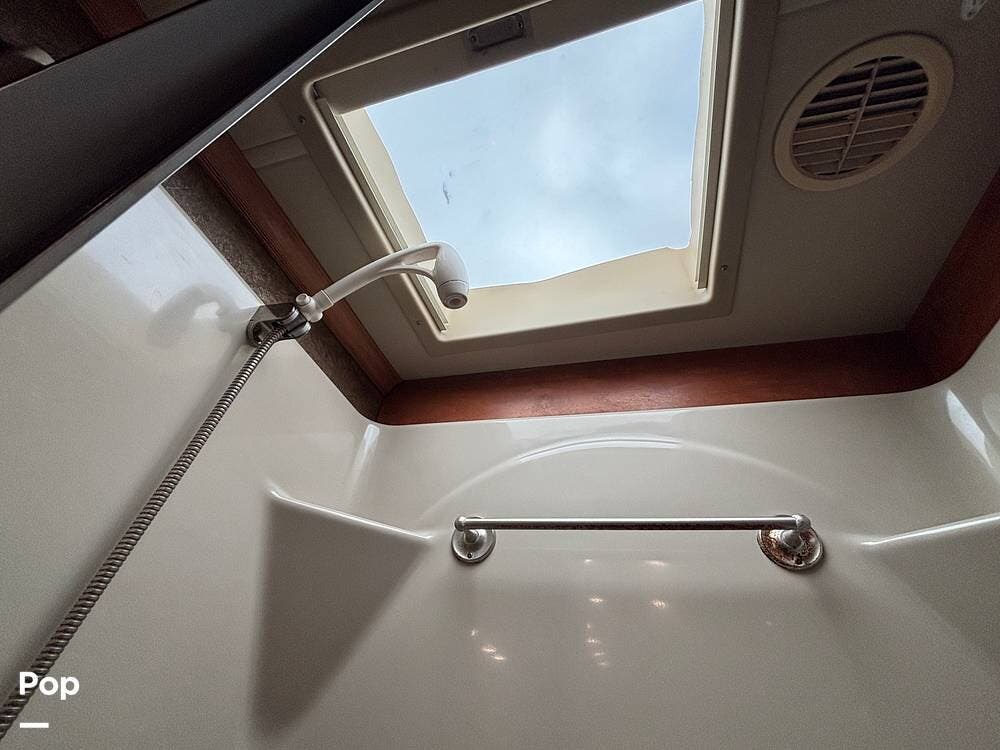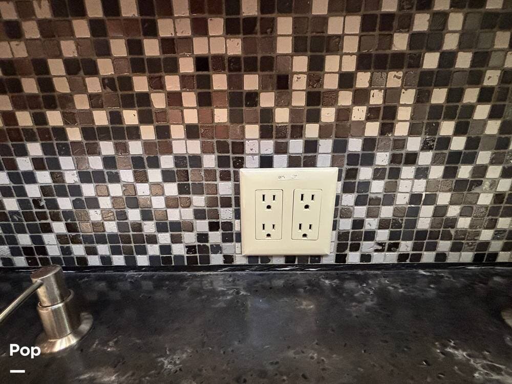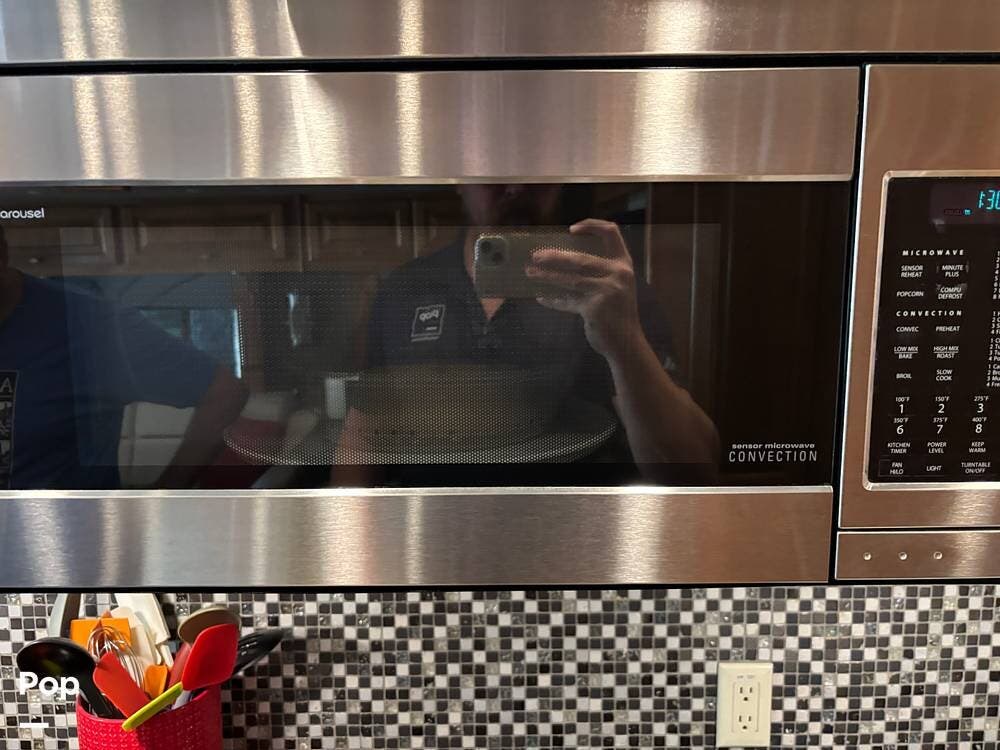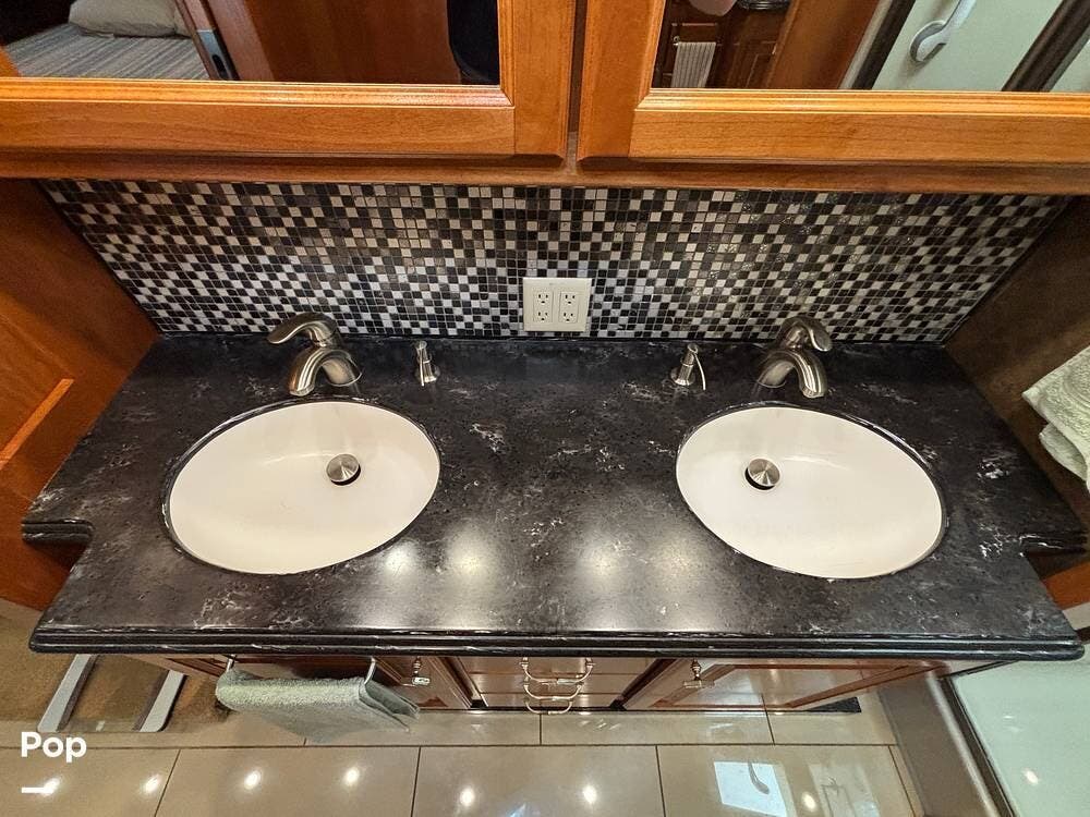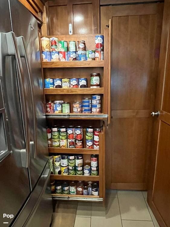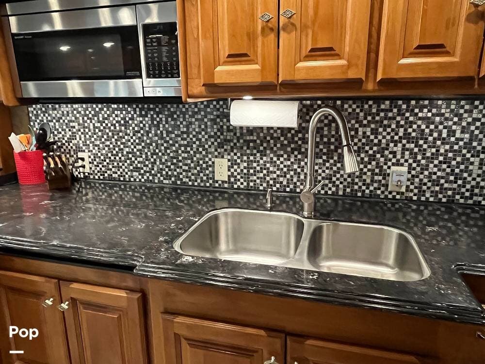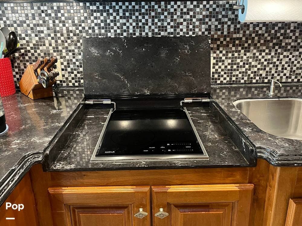 The kitchen is thoughtfully designed with solid-surface countertops, a residential refrigerator, and a convection microwave. The cooktop features covers to maximize counter space when not in use, along with a double sink that simplifies meal prep and cleanup. With ample cabinetry and pantry storage, this galley can easily handle both everyday use and extended travel.
