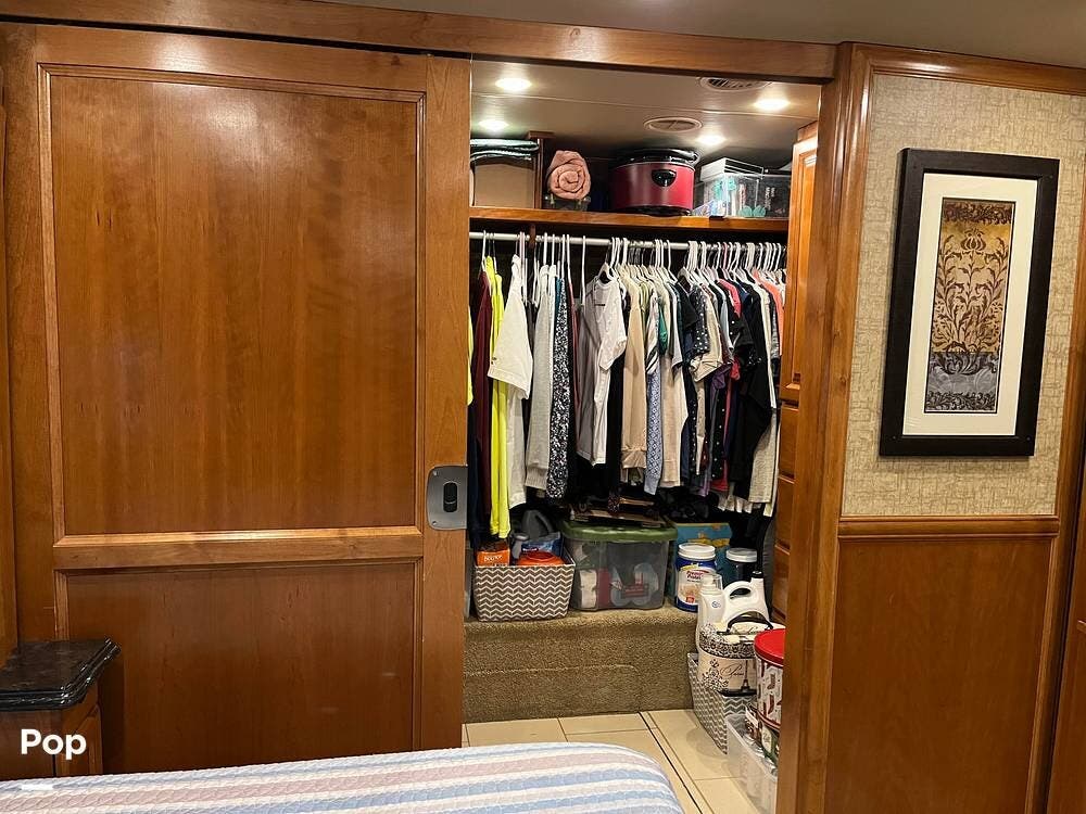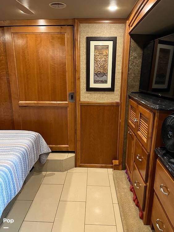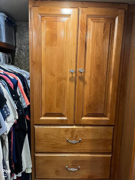 In the bedroom, a king-size bed serves as the centerpiece, surrounded by overhead storage and nightstands. A large wardrobe and dresser provide plenty of room for clothing and personal belongings, while a second television offers entertainment in the evening. The bedroom layout is designed for both comfort and convenience, making it an ideal retreat after a day on the road.