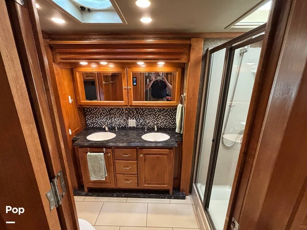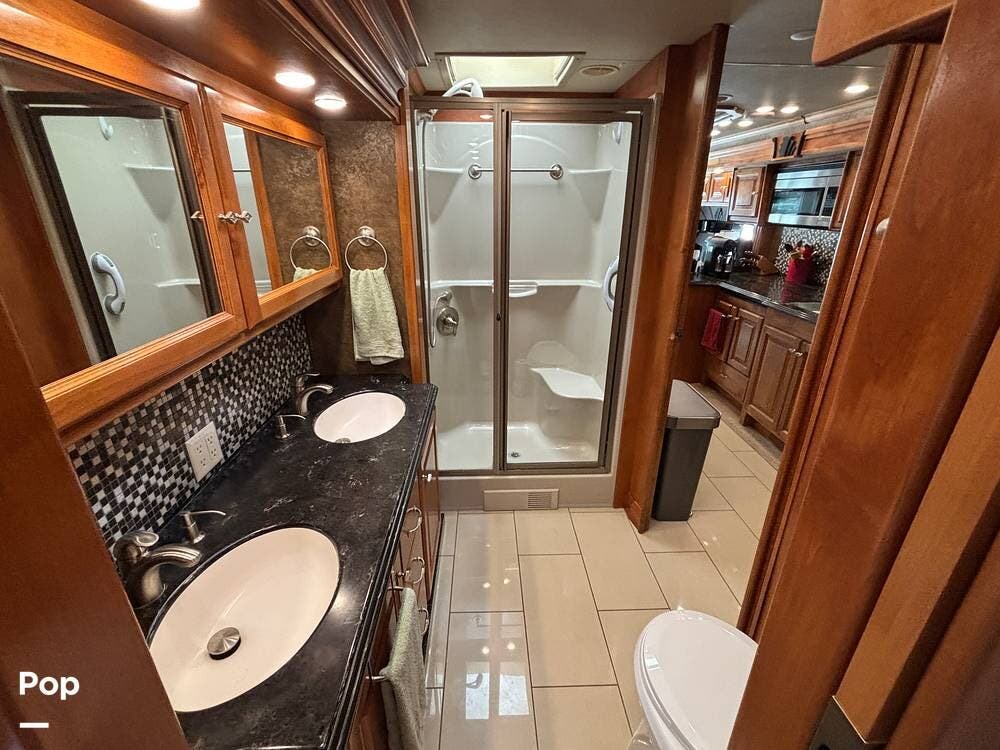 The bathroom spans the width of the coach and includes dual vanities, a spacious shower with a glass enclosure, and a porcelain toilet. Additional storage cabinets make it easy to keep toiletries and linens organized, while the well-lit design ensures the space feels open and functional. This setup gives the comfort of a residential-style bathroom while traveling.