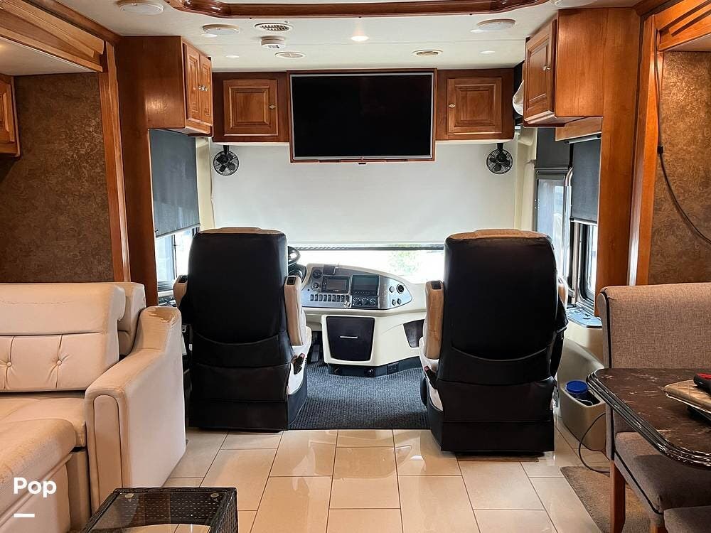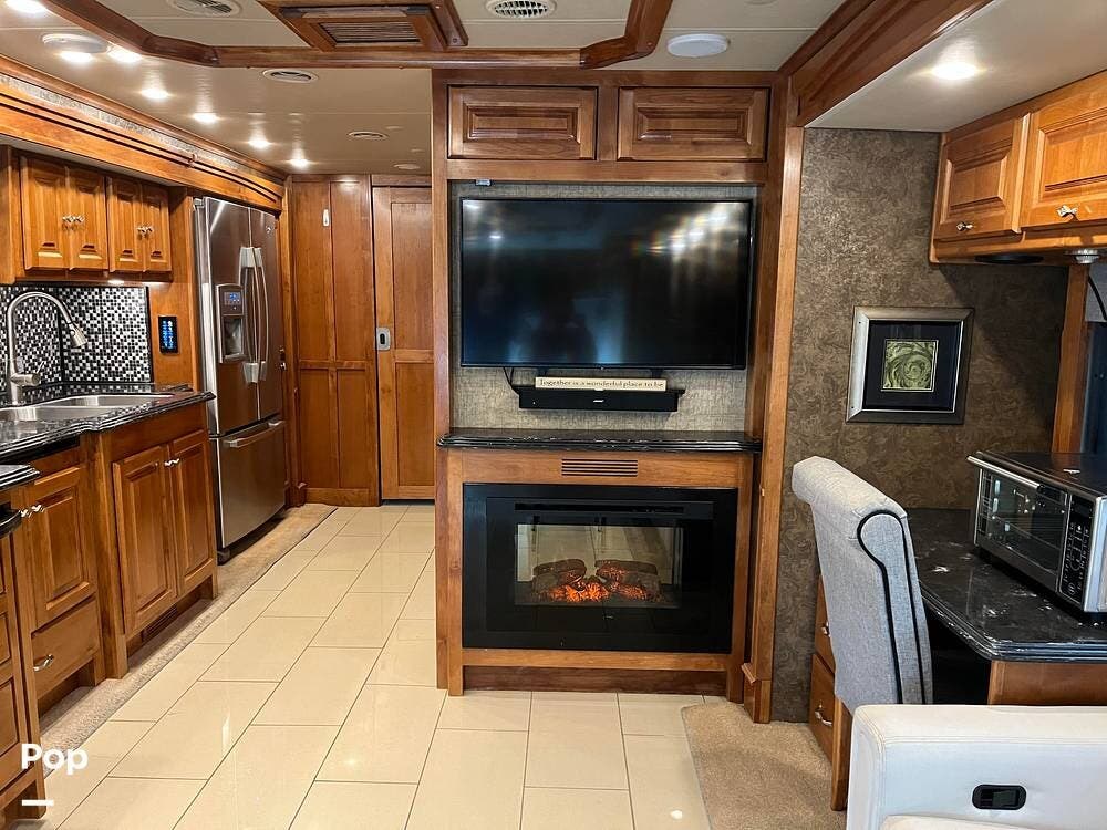 Stepping inside, the living area presents an inviting space with opposing sofas and a fireplace, creating a comfortable, residential feel. Large windows bring in natural light, and the overhead cabinets provide ample storage space for travel essentials. The flat-screen television is positioned for easy viewing, making it a perfect place to relax, whether you are parked for a weekend or a full season.