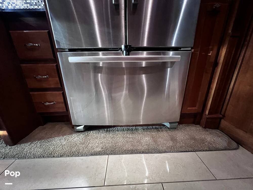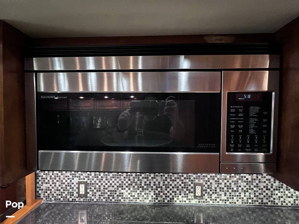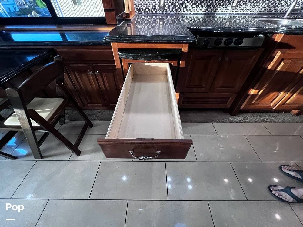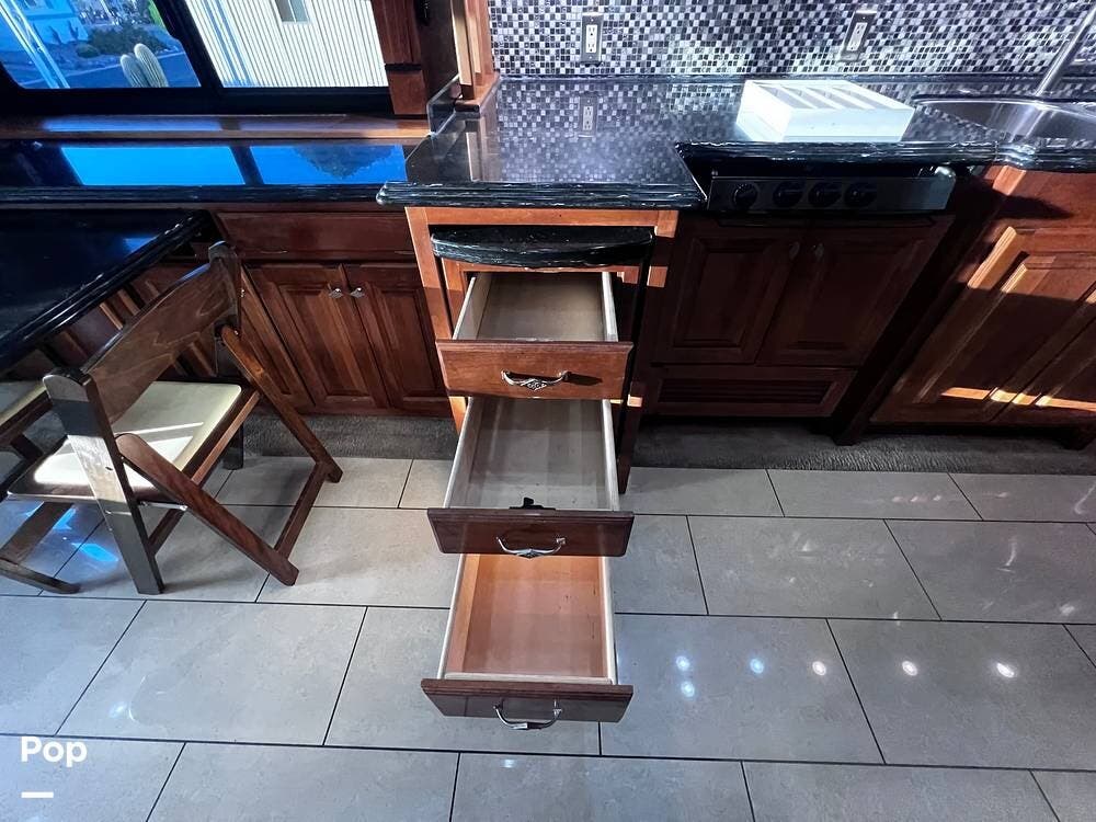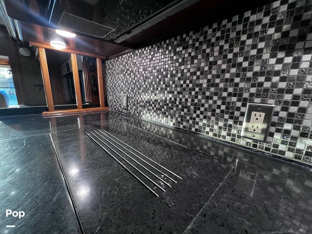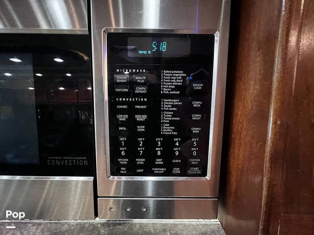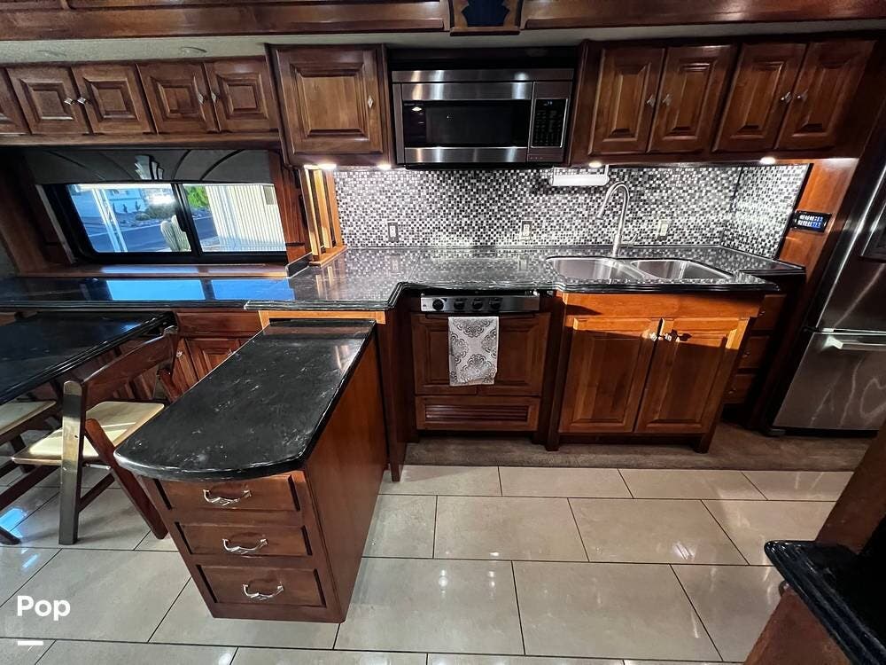 The gourmet kitchen is a traveling wonder. The pull-out extension with drawers expands lengthy solid-surface countertops. The kitchen includes an induction stove and a convection microwave oven. The refrigerator is residential size. The kitchen also has a pull-out kitchen counter. It provides lovely additional counter space.