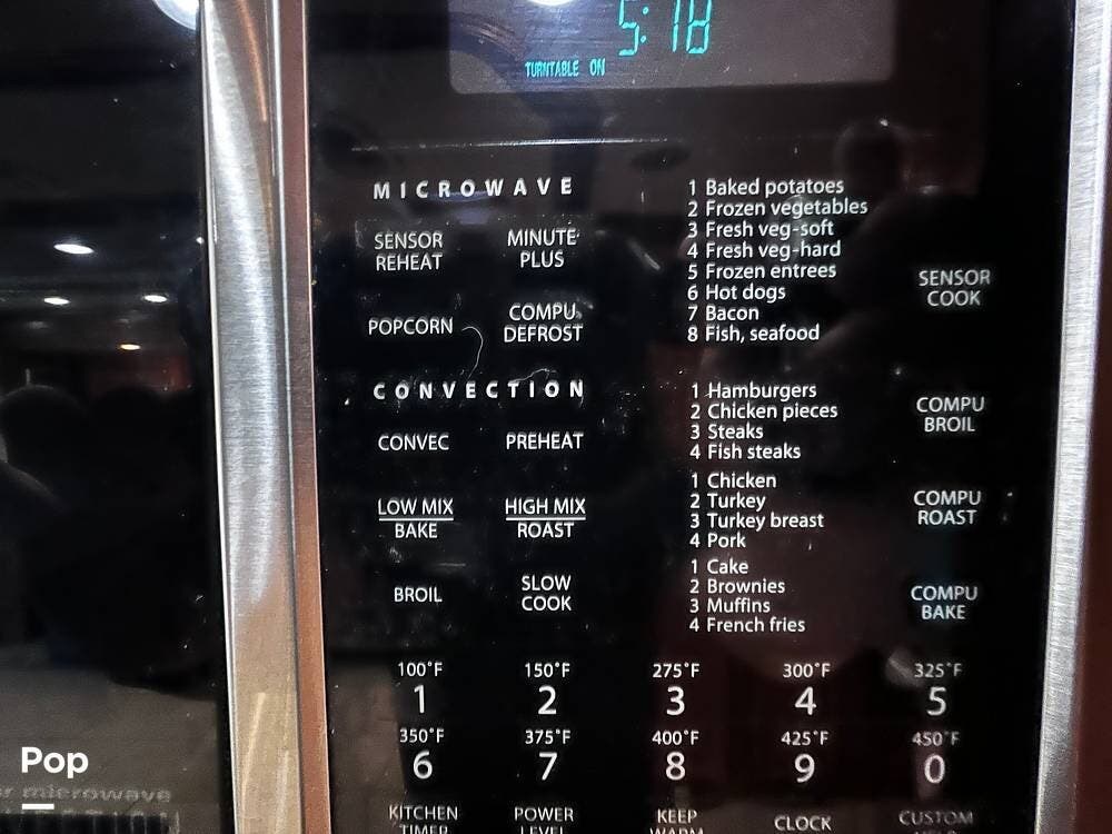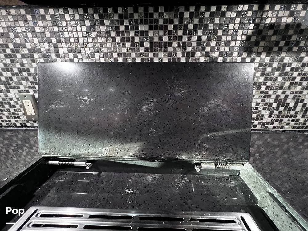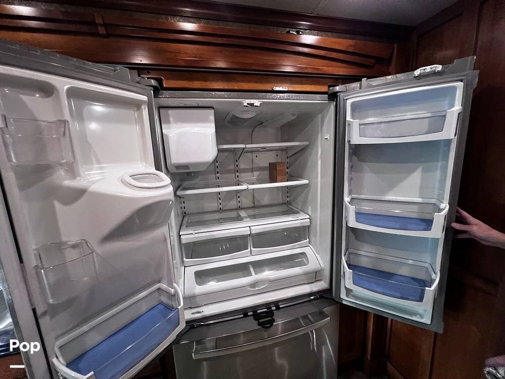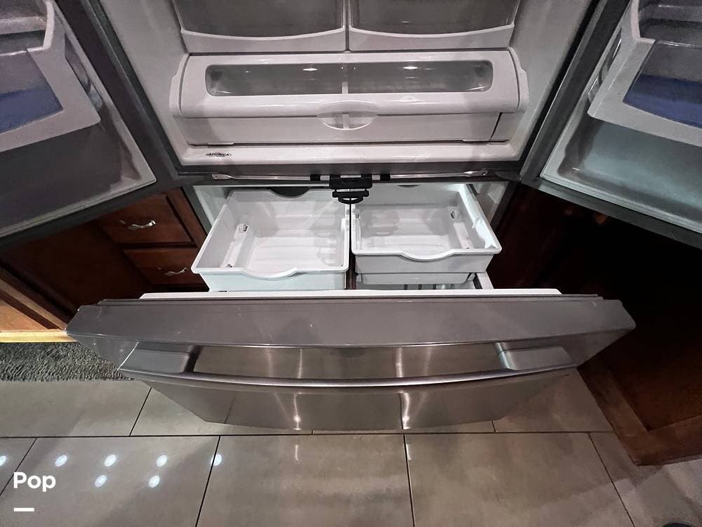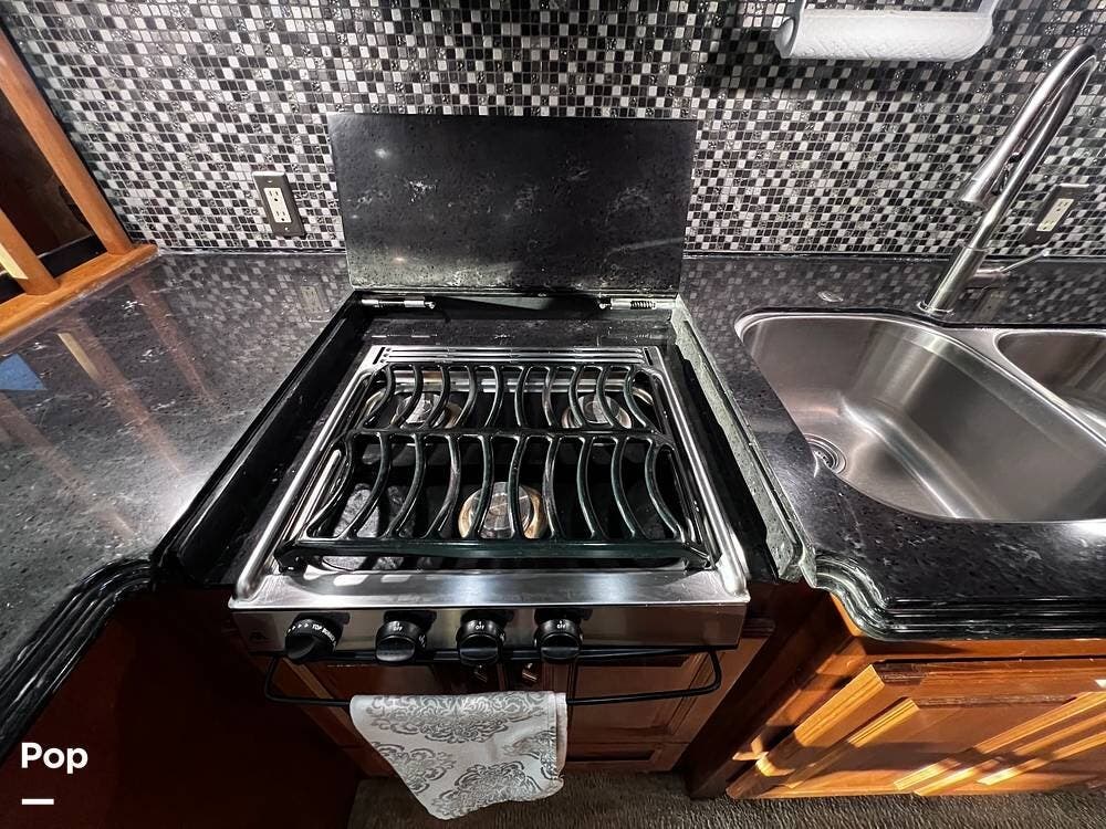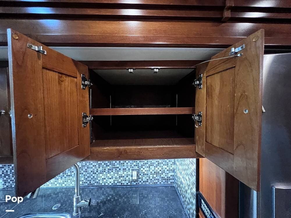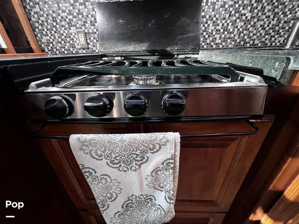 The gourmet kitchen is a traveling wonder. The pull-out extension with drawers expands lengthy solid-surface countertops. The kitchen includes an induction stove and a convection microwave oven. The refrigerator is residential size. The kitchen also has a pull-out kitchen counter. It provides lovely additional counter space.