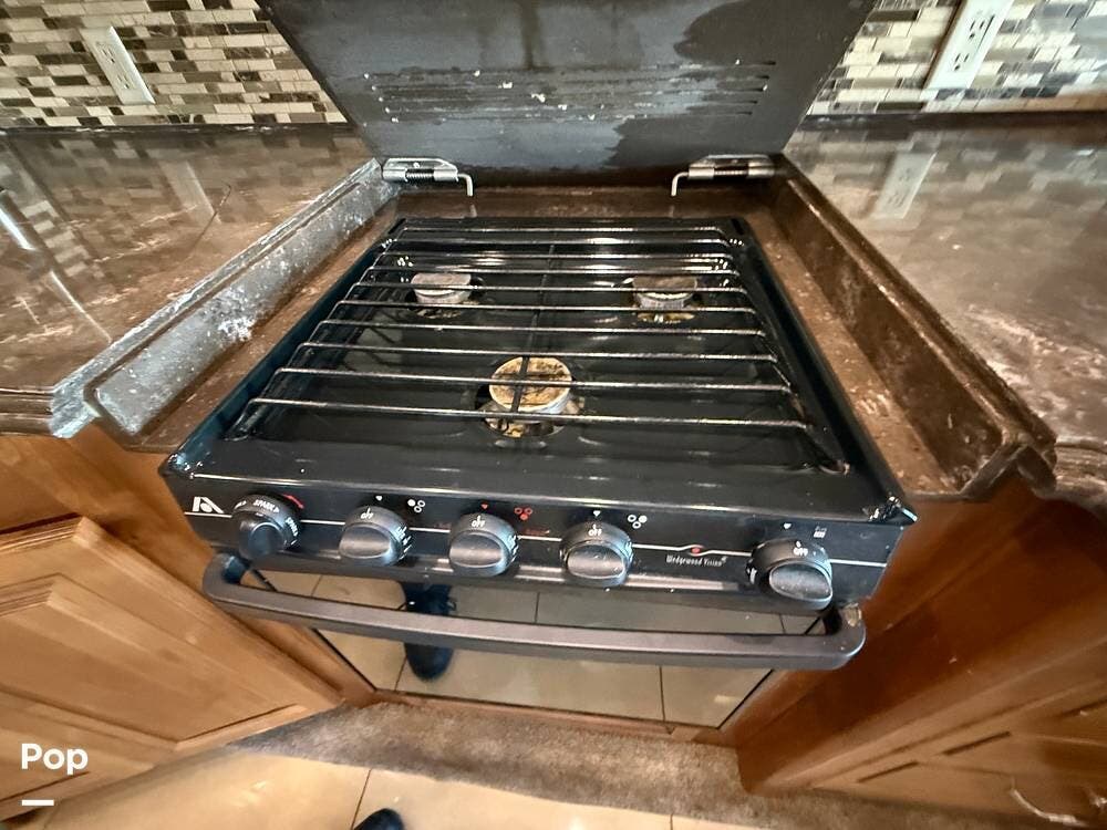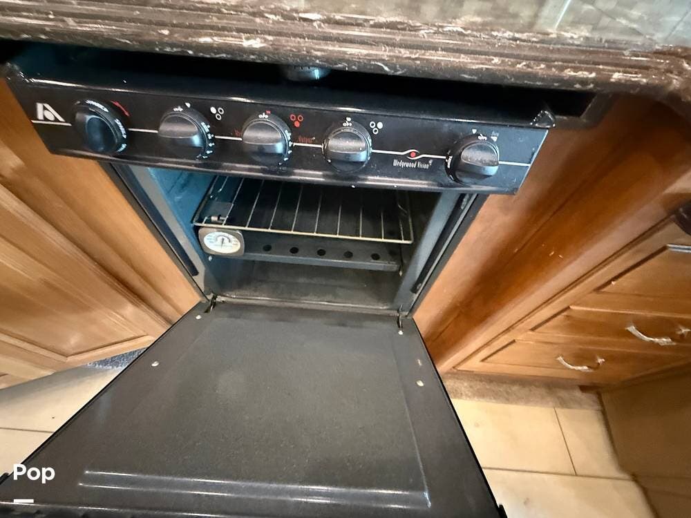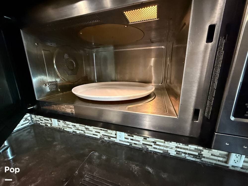 The kitchen is fully equipped with a 3-burner stove, convection microwave, double sink, and stainless steel refrigerator/freezer. Entertainment includes two TVs, a DVD player, surround sound, and more. The living area has a fireplace, recliner, and a dining table with chairs.