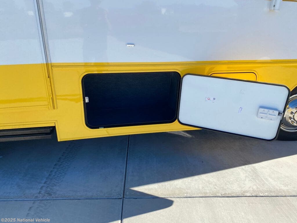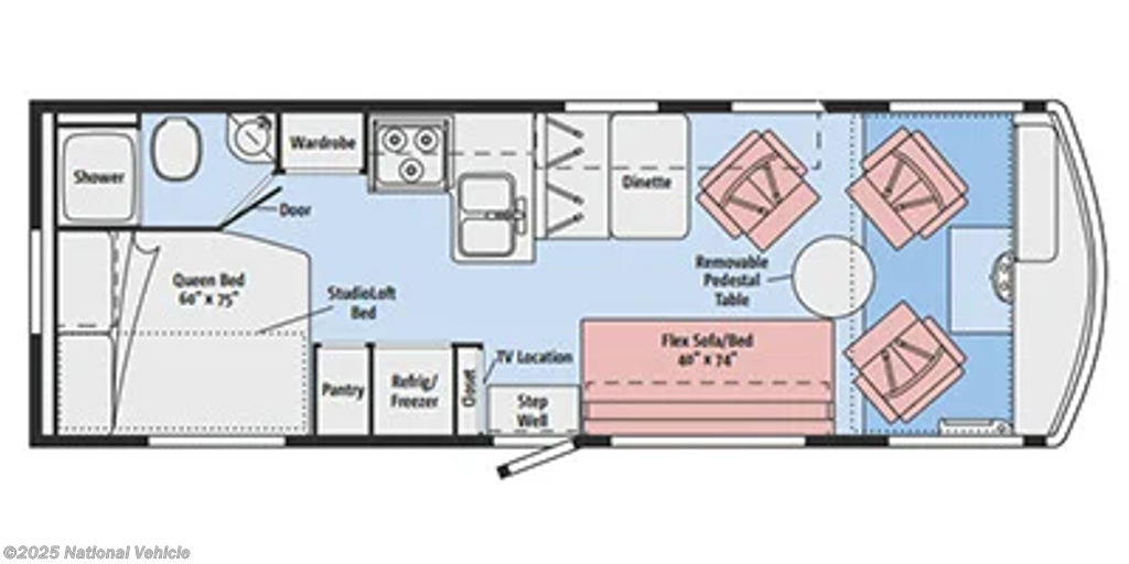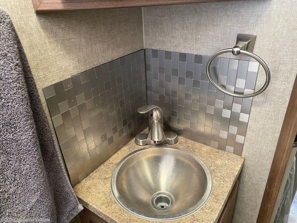 The well-equipped kitchen includes a three-burner range, oven, microwave, refrigerator, pantry storage, and ample counter space?giving you everything you need to prepare meals just like at home. A mid-coach entertainment center ensures great visibility from the main living area, creating a welcoming space to unwind after a full day of travel or adventure.
