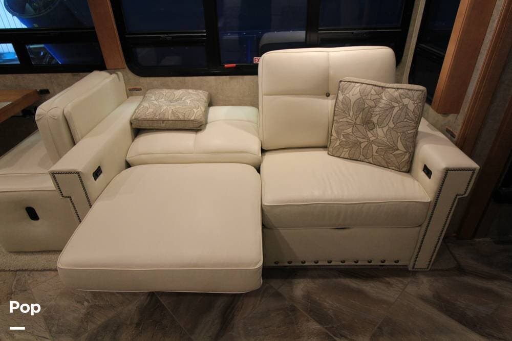 Featuring a front living floorplan, the space includes two convertible sofas, and both the driver's and passenger's seats swivel to the living room for additional seating.