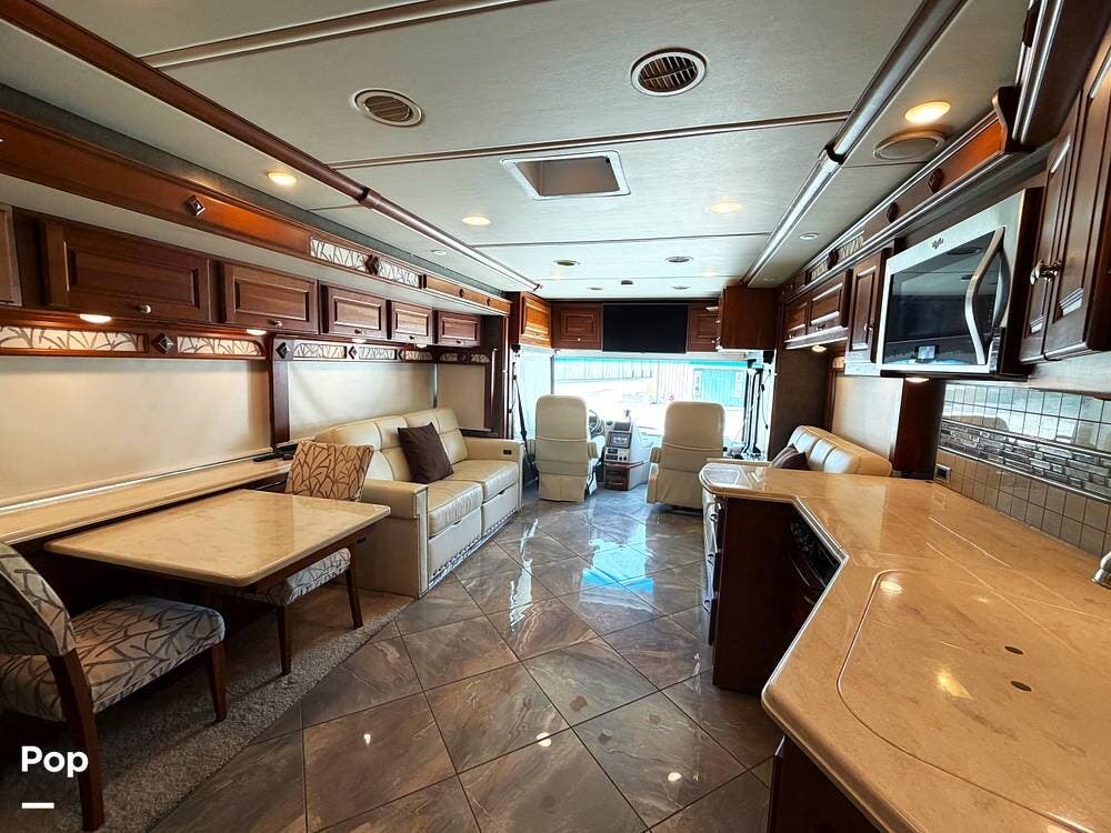 The expansive living room features opposing slides, comfortable seating, and a large TV for entertainment, while the well-equipped kitchen offers ample counter space, a residential refrigerator, a convection microwave, and abundant storage. A freestanding dinette makes mealtime comfortable and functional.