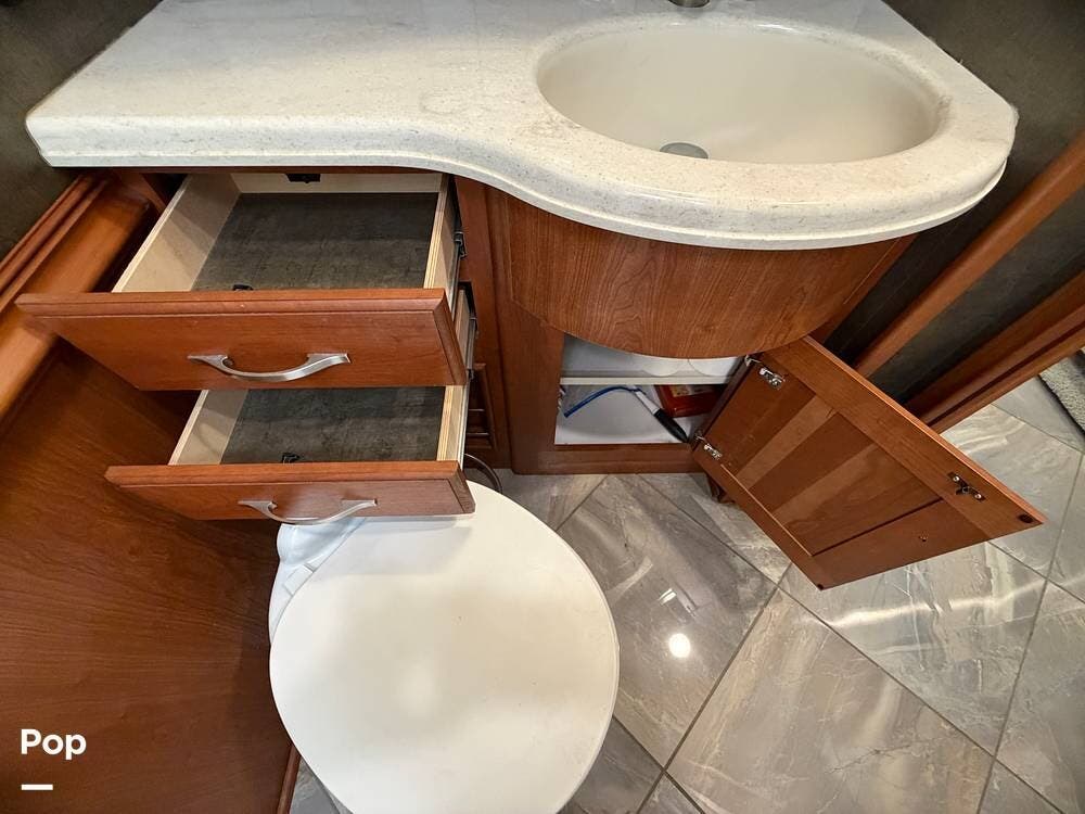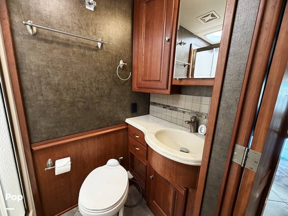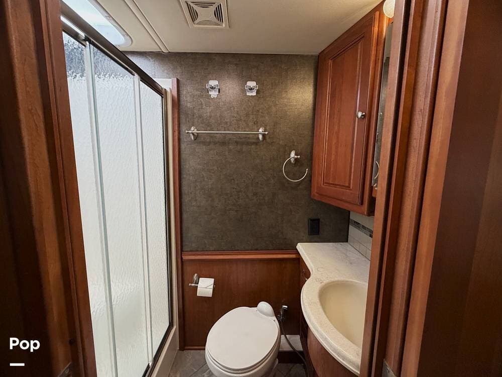 The mid-coach bath is thoughtfully designed with a large shower, a solid-surface vanity, and plenty of linen storage.