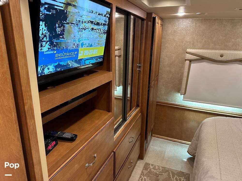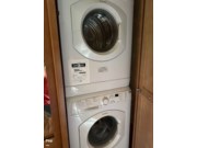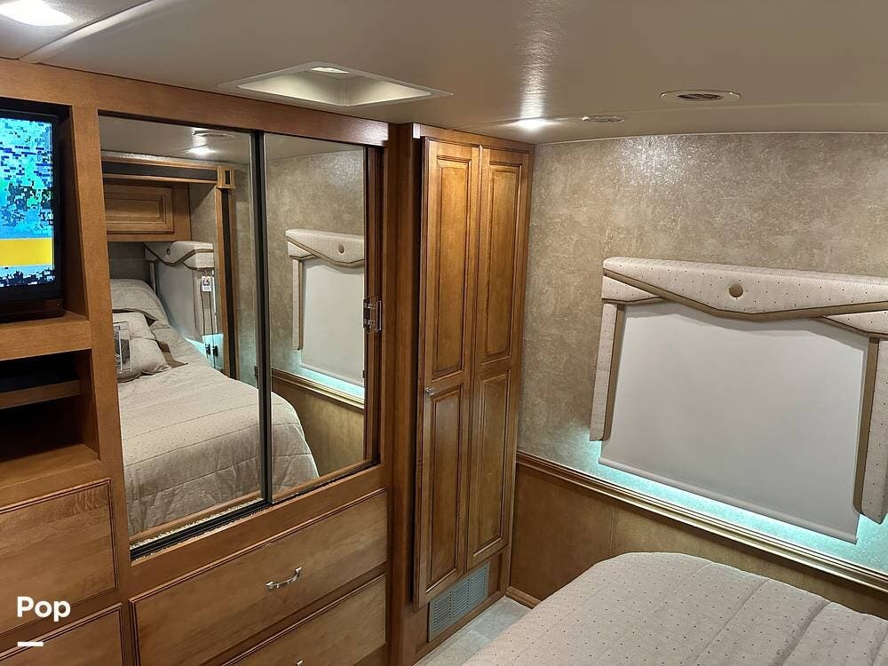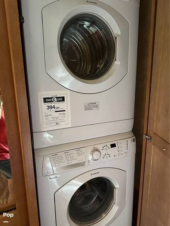 The master bedroom, located at the rear, offers a peaceful retreat. It features a queen-sized bed with overhead cabinets and a large wardrobe. A washer and dryer are also included in the bedroom, enhancing its appeal for long-term travelers. A second television is mounted in the bedroom for added entertainment.