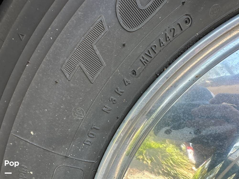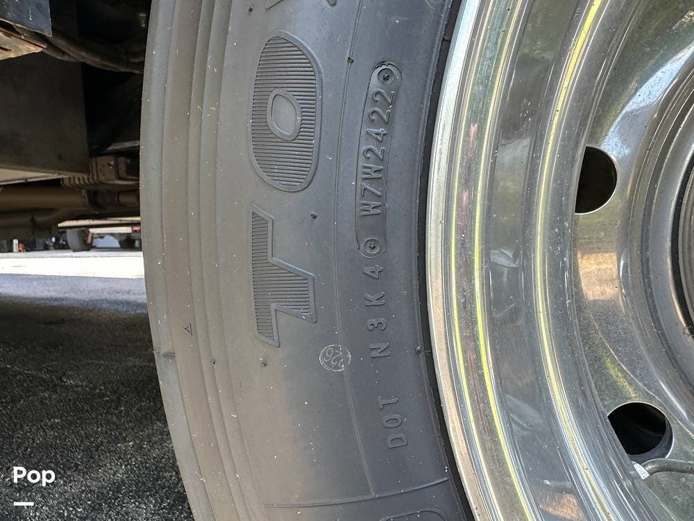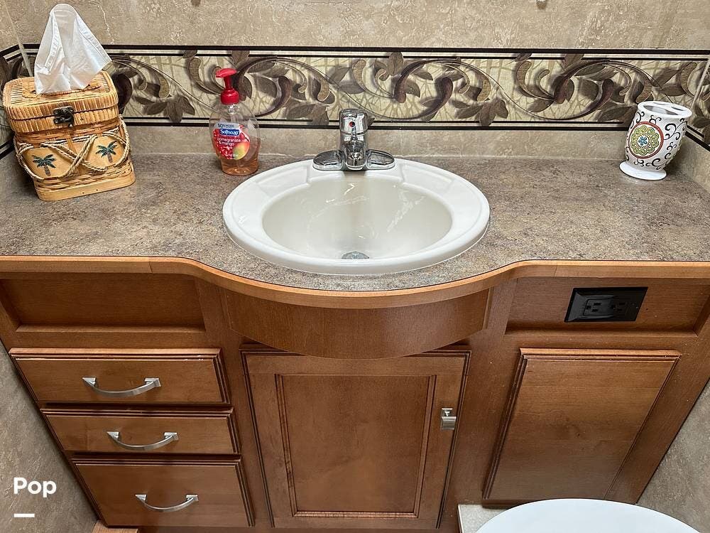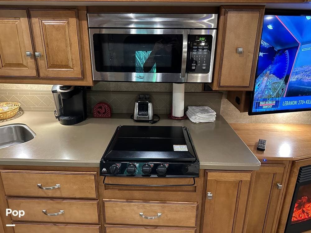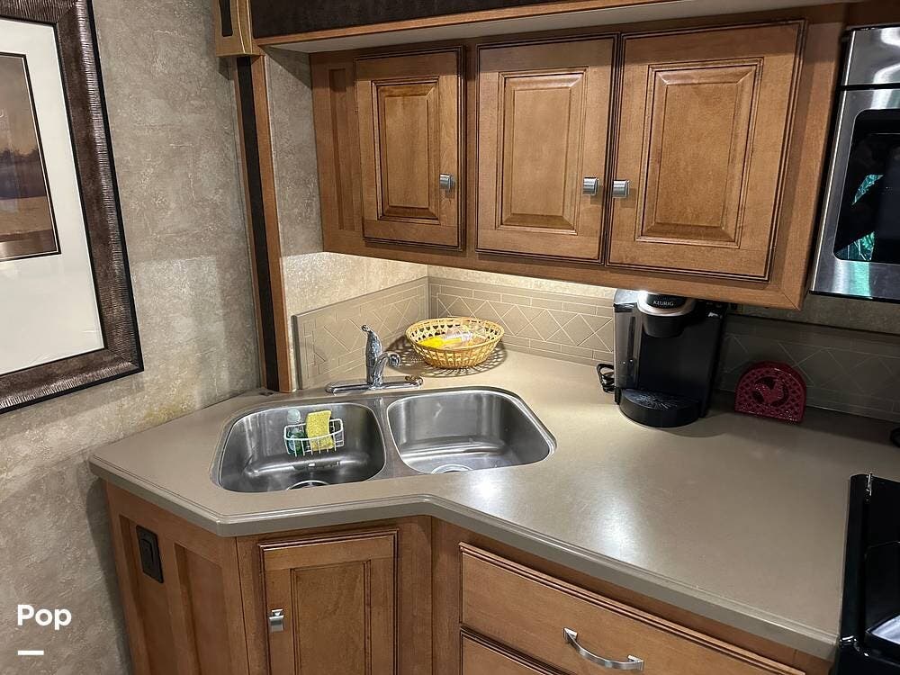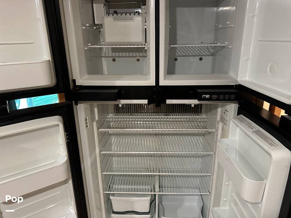Continuing into the kitchen, you'll find a residential-style layout that offers a solid-surface countertop, a stainless steel double-basin sink, and a stove with an oven alongside a convection microwave for versatile cooking options. The refrigerator is full-sized, perfect for storing groceries for extended trips, and there's plenty of cabinet space for dishes, cookware, and pantry items.