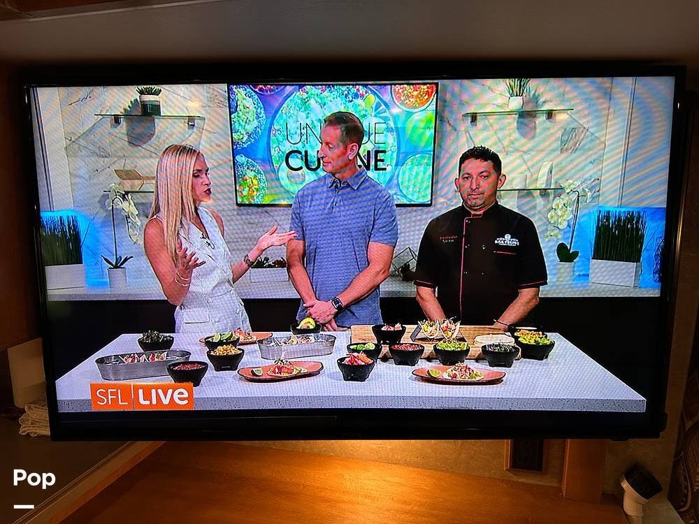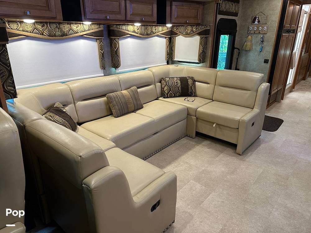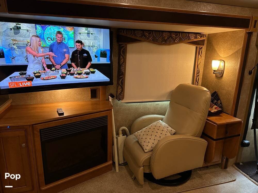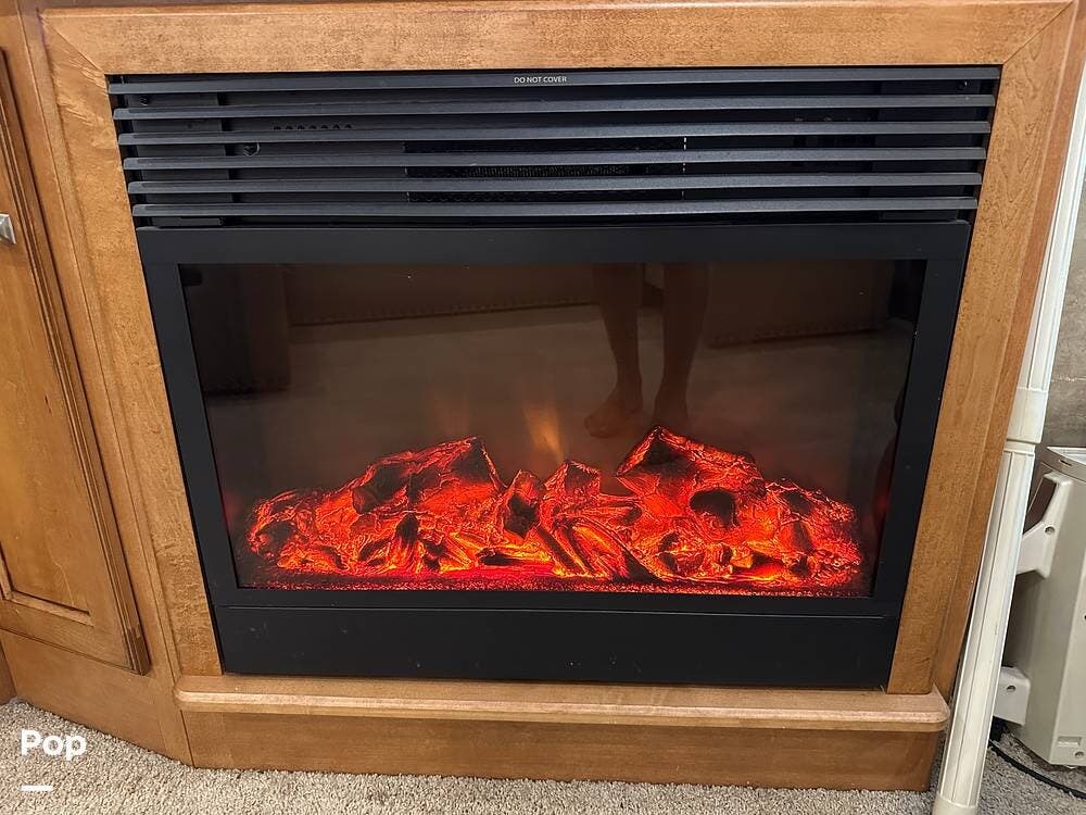 Upon entering the motorhome through its side entrance, you're greeted by an open and spacious interior thanks to its triple-slide design, which expands the living space significantly when parked. The living area features a large sofa that can convert into a bed, facing an entertainment center with a flat-screen TV and a fireplace, adding warmth and ambiance.