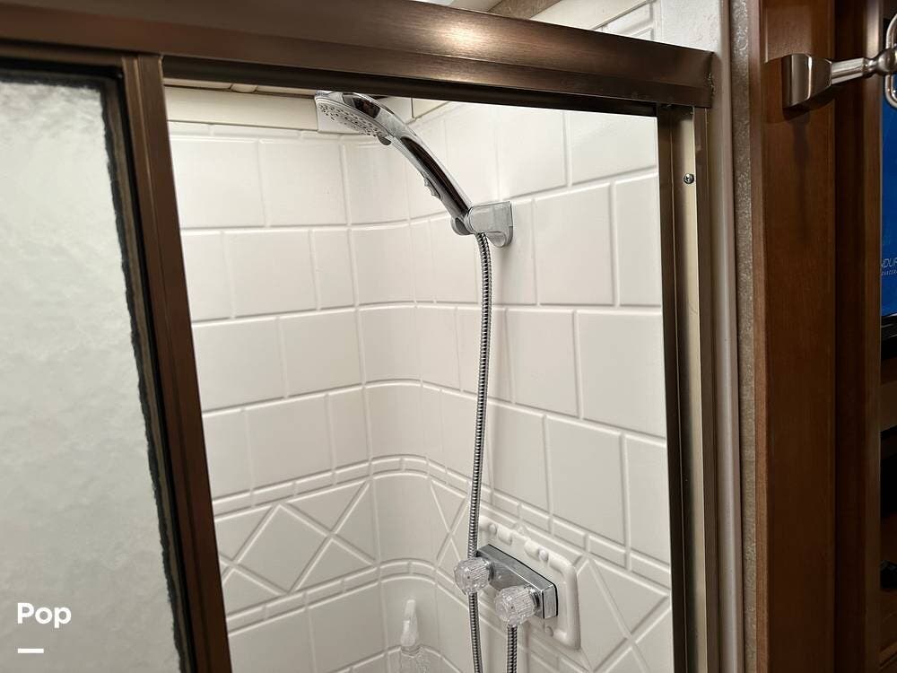 Moving towards the rear of the coach, a well-appointed bathroom sits mid-coach, equipped with a glass-enclosed shower, a porcelain toilet, and a vanity with storage below. The bathroom space is well-lit and designed for convenience, making it feel more like a residential bathroom than a typical RV setup.