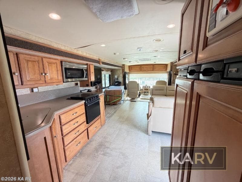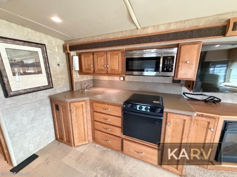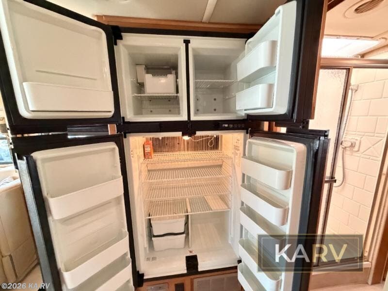 Step inside and find a large slide out inLounge to your right featuring seat belts, and the ability to extend for added seating. There is a slide opposite that features an inTable, recliner, 48" HDTV with electric fireplace below, counter space, a three burner range, and double kitchen sink. The 4-door refrigerator/freezer is opposite just to the left of the main entrance.