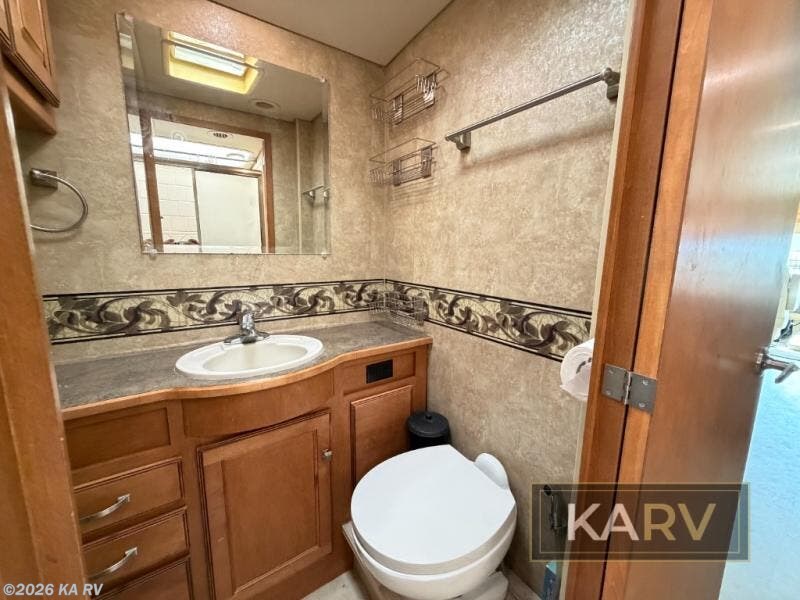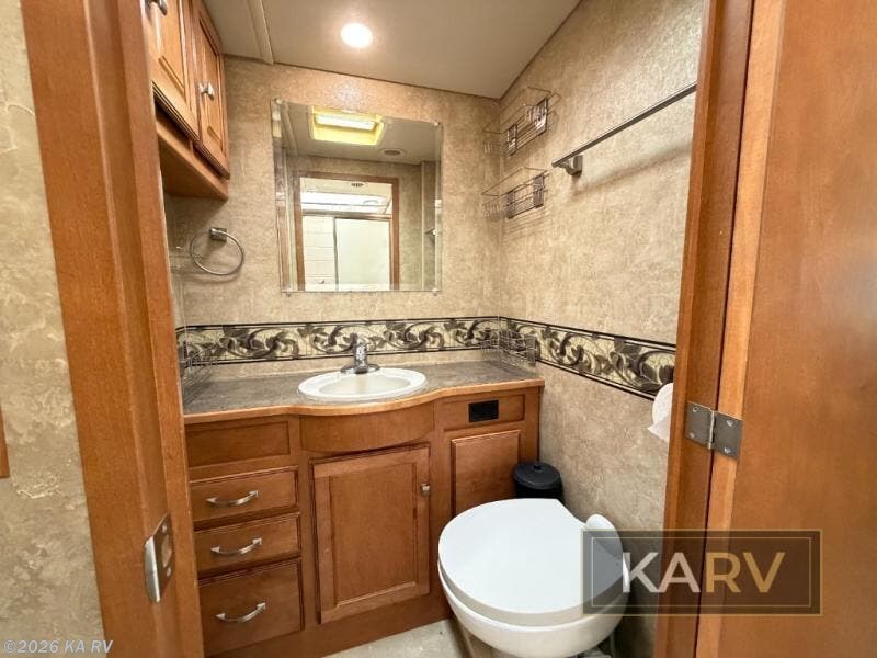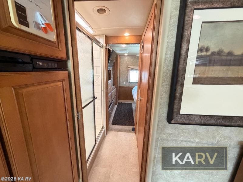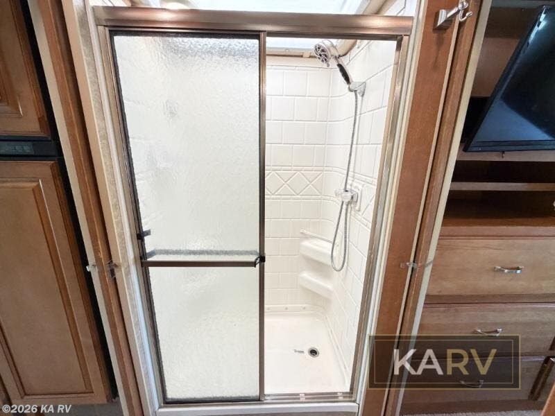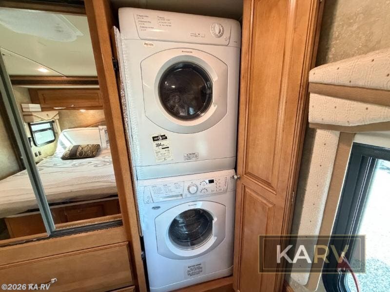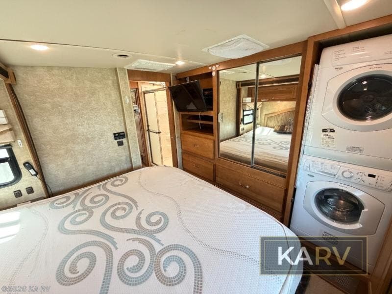 A second sliding door separates the bathroom from the bedroom and features a queen size bed slide with nightstands, wardrobe, chest of drawers along with a 28" HDTV above, and a storage cabinet that can also be used as the location for a washer and dryer if you wish to add, plus more!