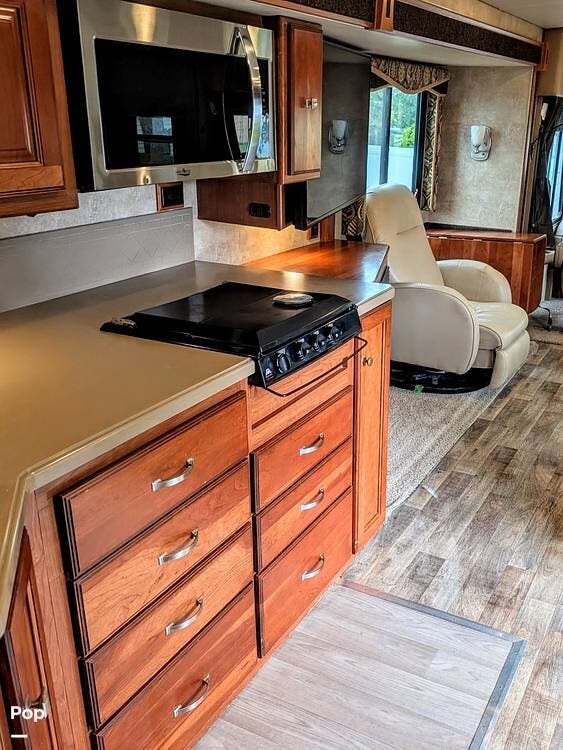 Continuing into the kitchen, you'll find a residential-style layout with a solid-surface countertop, a stainless-steel double-basin sink, and a stove, along with a convection microwave for versatile cooking options. The refrigerator is full-sized, perfect for storing groceries for extended trips, and there's plenty of cabinet space for dishes, cookware, and pantry items.