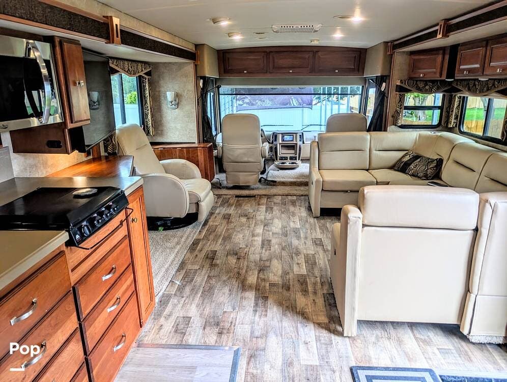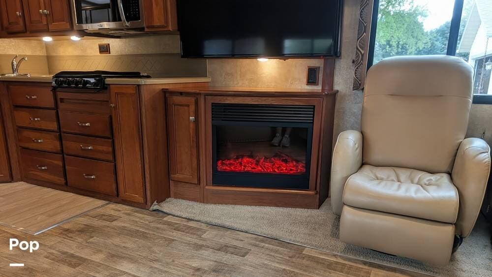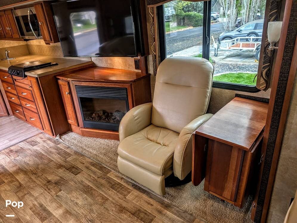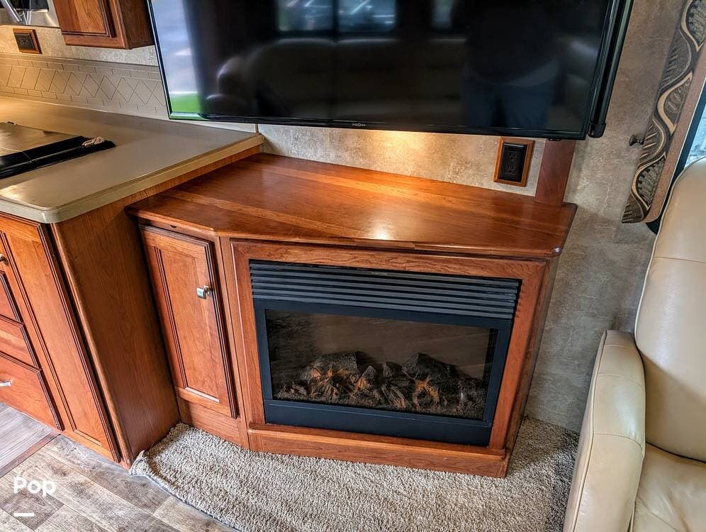 Upon entering the motorhome through its side entrance, you're greeted by an open, spacious interior thanks to its triple-slide design, which significantly expands the living space when parked. The living area features a large sofa that can convert into a bed, facing an entertainment center with a flat-screen TV and a fireplace, adding warmth and ambiance.