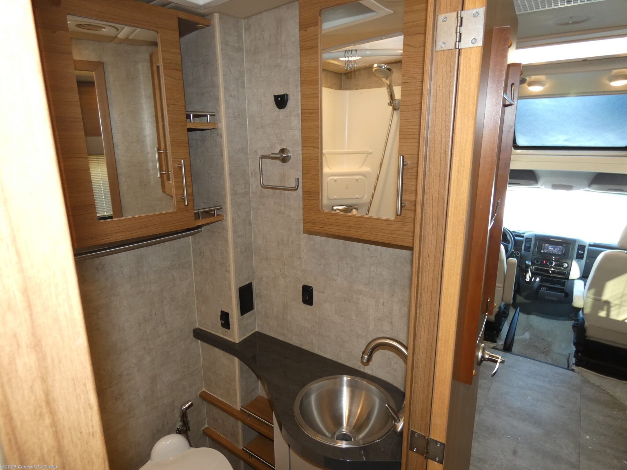 Take to the road in this Winnebago View and know that you will have everything you need to enjoy spending time away from home. Model 24G features a single slide for added space, a rear bedroom, and sleeping for five with the optional cabover bunk choice. Step inside and enjoy a slide out sofa sleeper with table straight ahead for meals, or just for hanging out. You can also choose an optional L-shaped sectional dinette with table instead of the sleeper sofa. There is a place for a moveable pedestal table that sits in the main room between the front driver and passenger seats when they are swiveled around. The kitchen area is to the left of the entry door and features a double sink, counter space, a two burner cook-top, pantry, and refrigerator. You will also find plenty of overhead cabinets for storage too. Beyond the sofa heading toward the rear of the coach you will find a side bath with corner shower, toilet, linen cabinet, and vanity with round sink. A nice size wardrobe is found just around the corner from the bath before you step up to the bedroom floor area. The rear bedroom in model 24G features a slide out rear queen sized bed with dual bedside storage cabinets, plus overhead cabinets space as well. There is also a spot to mount an optional flat screen 22" HDTV in the bedroom just off the foot of the bed along the wall.