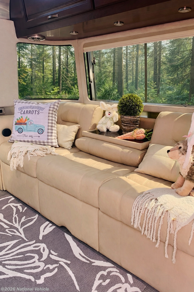 The fully equipped kitchen features solid-surface countertops, a convection microwave, three-burner cooktop, oven, and a large refrigerator?perfect for preparing meals wherever you roam. The comfortable living area includes plush seating and a premium entertainment system for relaxing evenings.