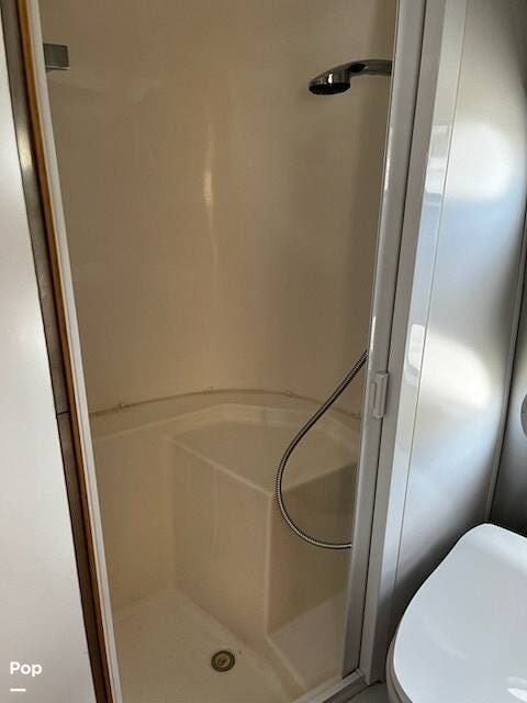 The rear bath has everything you need -- a full shower, porcelain toilet, vanity, and medicine cabinet -- all in a clean, efficient package.