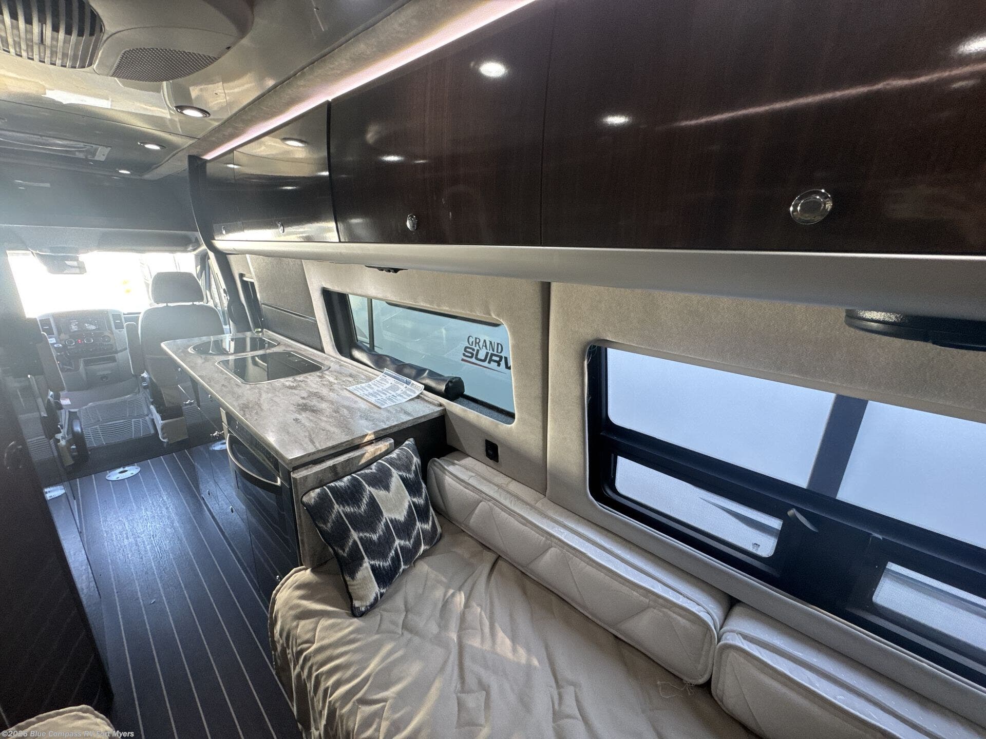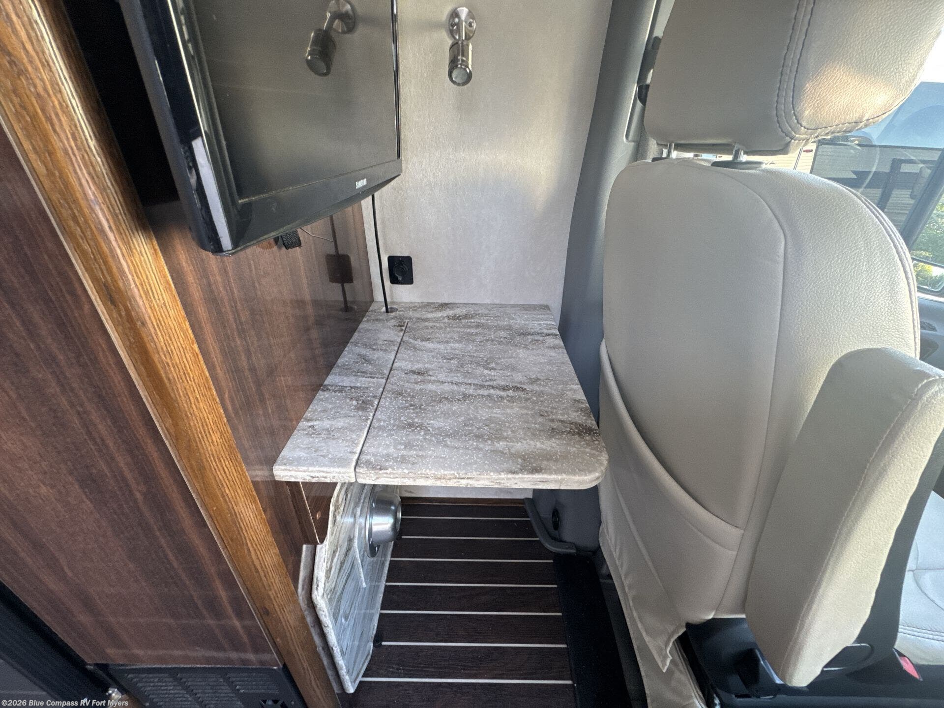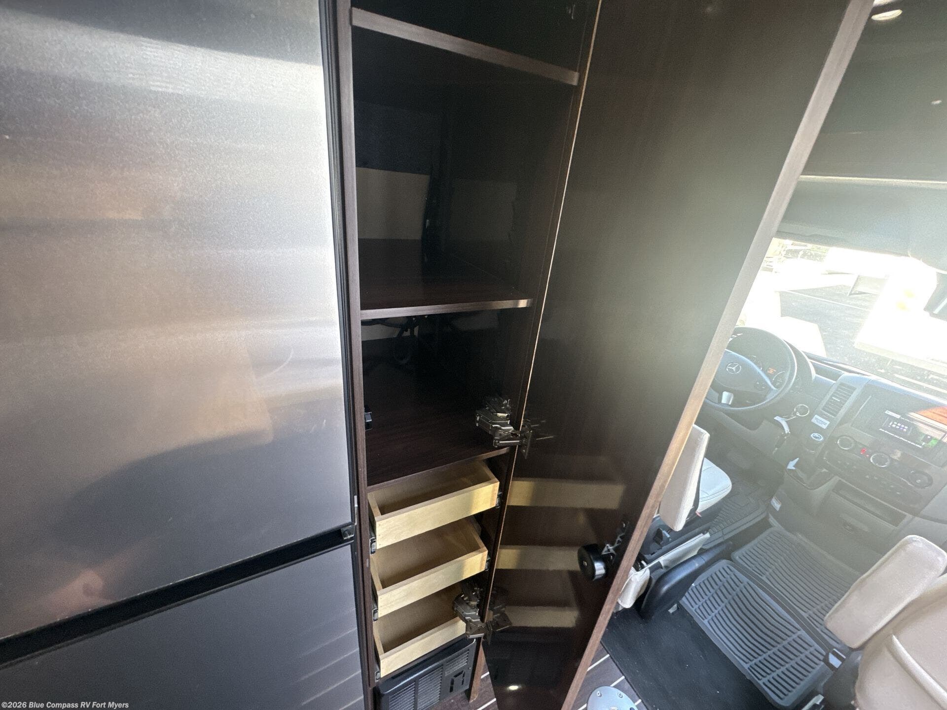 Get ready to drive and stay in comfort and luxury in this motorhome with everything you need and everything you didn't even know you wanted! The heated driver and passenger seats swivel to face the interior living space allowing you to utilize the Corian countertop with backsplash. Whip up a meal using the galley kitchen featuring a single-burner induction cooktop, and a sink and faucet, plus extra counter space for food prep. There is also a 1.2 cu. ft. drawer microwave, plus a pantry with built-in drawers and a refrigerator with a freezer across from the sink. The power sofa in the rear can be fully flat with a push of a button so two can sleep or rest. And there is storage throughout for your hanging clothes, towels, luggage, dishes and more.