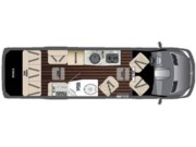 At the rear, the power sofa and lounge chairs transform into a spacious bed for two, with overhead wardrobe storage and hidden compartments to keep belongings organized. Privacy shades, power day/night window coverings, and Magic Suede interior wall accents enhance both comfort and style.