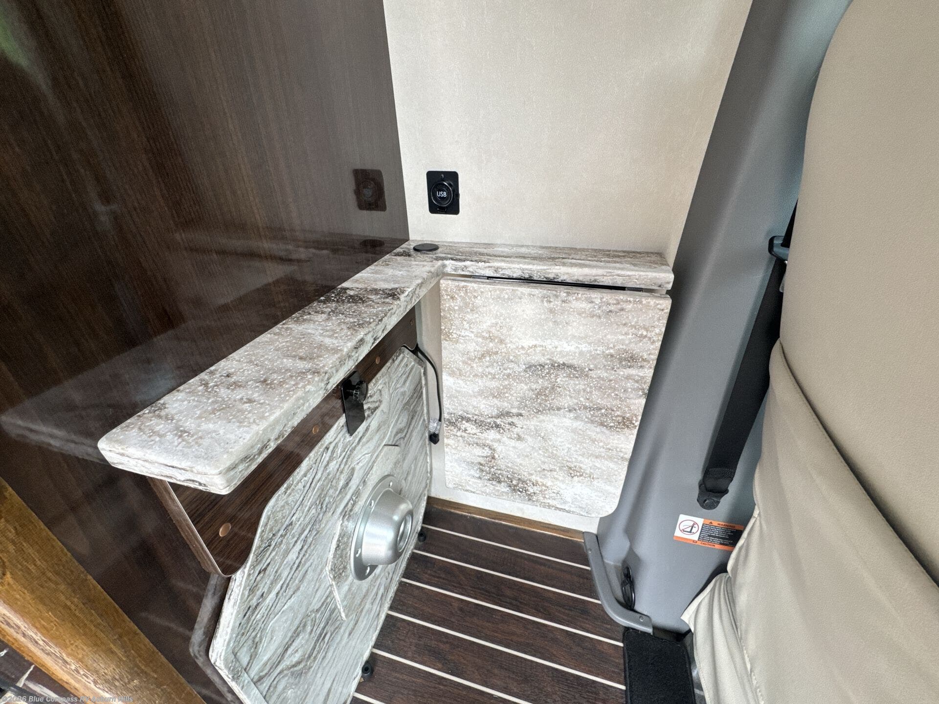Step inside and find a convenient conversation area with the driver and passenger seats swiveled around. There is a removable table between the driver and passenger seat which allows for ease while eating or easy ability to play a game. Behind the driver's seat there is a work station and a LED TV.