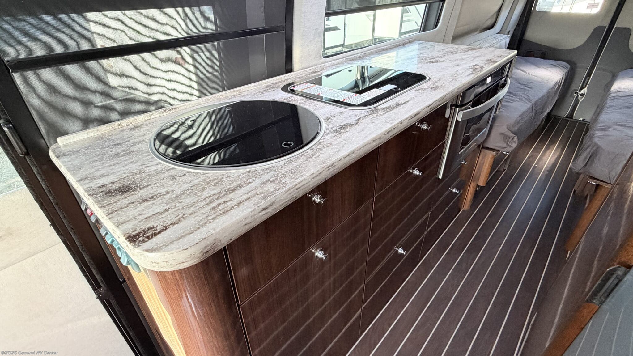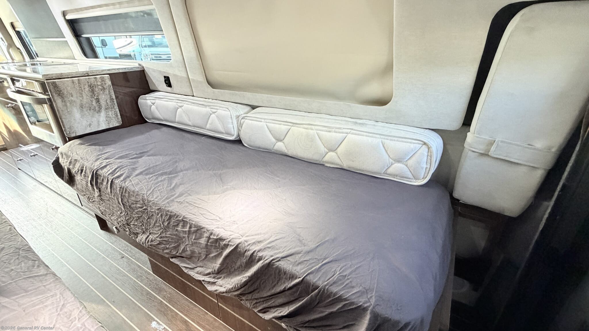 This Interstate Grand Tour EXT Twin Class B diesel coach is a great motor home to take on your next trip across the country. There is sleeping accommodations for two. Step inside and find a convenient conversation area with the driver and passenger seats swiveled around. There is a removable table between the driver and passenger seat which allows for ease while eating or easy ability to play a game. Behind the driver's seat there is a work station and a LED TV. The galley has a sink, two burner range, and extra counter space along one side. The opposite side offers a large pantry and refrigerator with freezer. As you move toward the rear notice a convenient wet bath on your right which includes a toilet, small sink, and shower. Continue further back and find two twin beds or you can convert them into a king. At the foot of one bed there is an overhead wardrobe and LED TV, plus more!