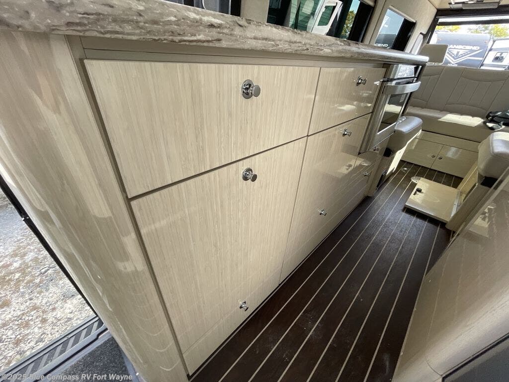 Step inside and find a convenient conversation area with the driver and passenger seats swiveled around and two additional lounge chairs, all with seat belts for safety while traveling. There is a removable table that can be placed in the center if you like, or in the pedestal holder further back in the coach.