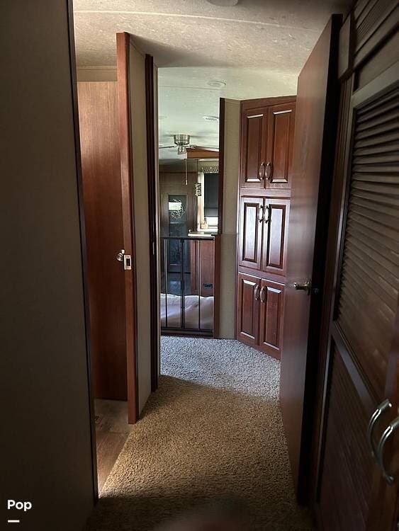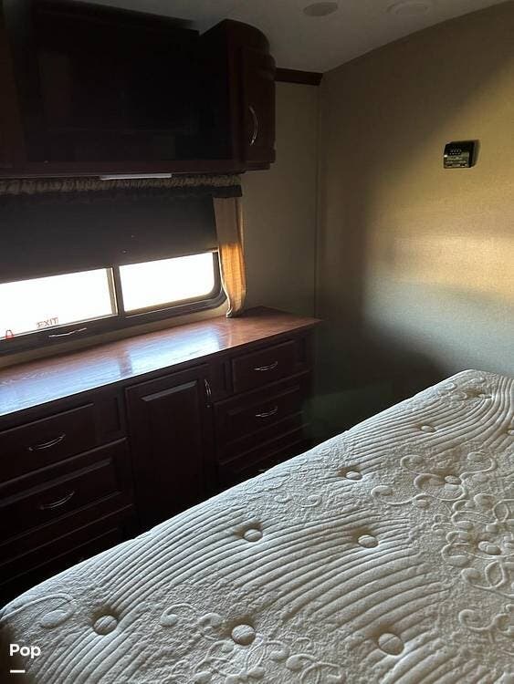 Step inside and you'll be greeted by a spacious living area designed for relaxation. Plush seating and warm decor create a cozy atmosphere, enhanced by MCD roller shades, wood plank linoleum, and elegant lighting. The built-in vacuum makes upkeep easy, while the entertainment setup provides comfort and convenience wherever you travel.