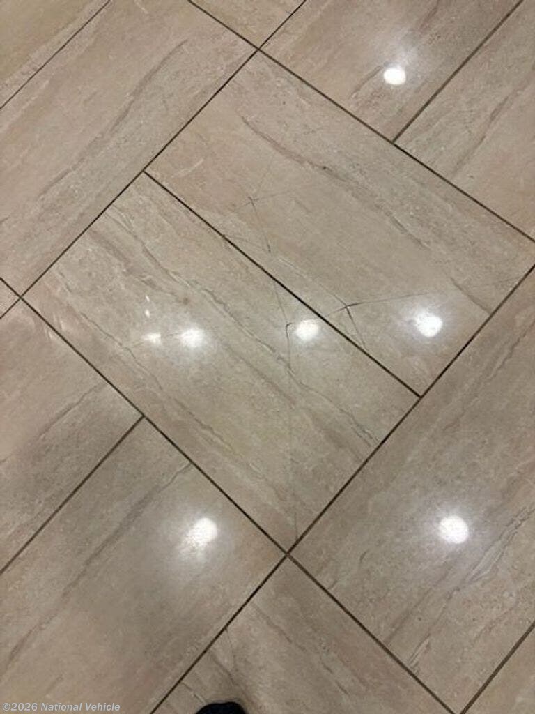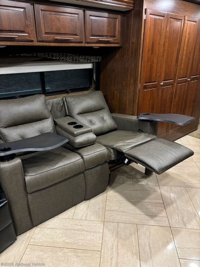 The interior features high-end finishes like porcelain tile flooring, hardwood cabinetry, solid-surface countertops, and a fully equipped kitchen with a residential refrigerator, convection microwave, and induction cooktop. Relax in the comfortable living area complete with an electric fireplace, large flat-screen TVs, and theater-style seating.
